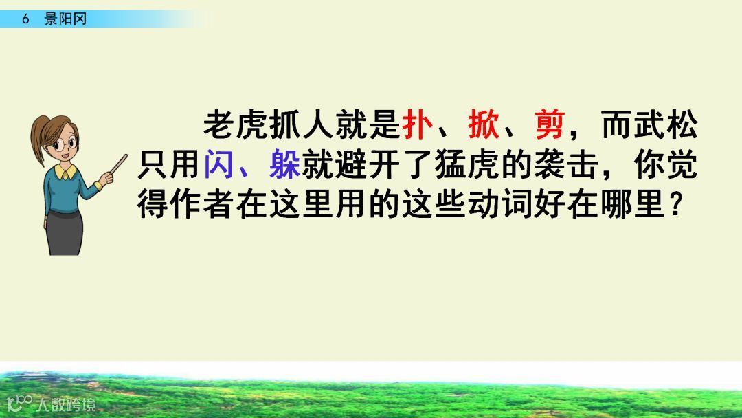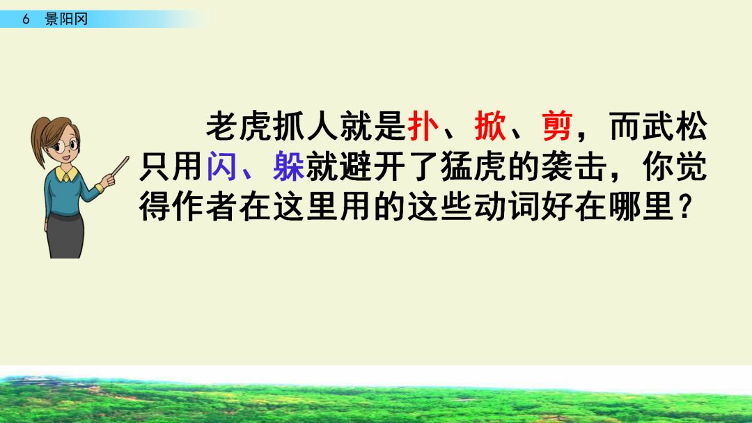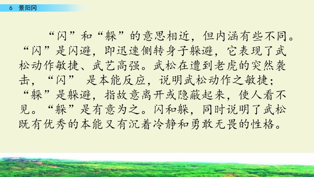 面对老虎的凶猛进攻,此时武松唯一的对策就是“闪”,一个接一个的“闪”字,乍看起来,好像轻描淡写,又是重复雷同,其实,它显示了作者在捕捉人物动作、表现人物形象方面的独到之处。不能换成“躲”字,因为“闪”字一是表现了动作的准确。武松在遭遇突然袭击、毫无防备的情况下,“闪”既是本能的反应,又是防御的手段。二是“闪”这个动作,具有突发性,用在这里,很能表现人物的机警敏捷。三是“闪”指主动地躲过,如果换用“躲”字,则会显得很被动。