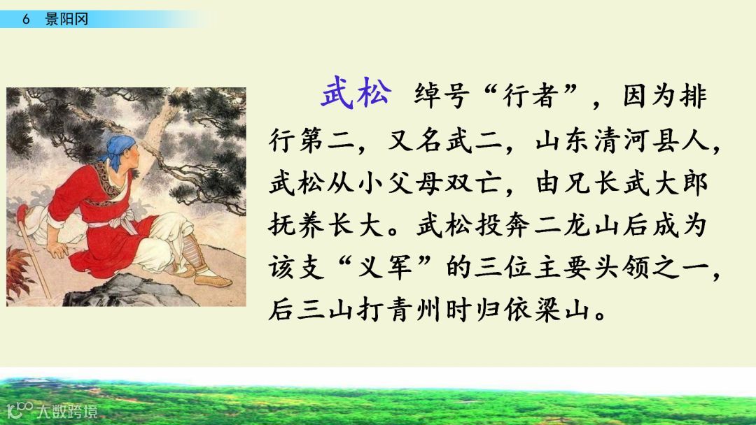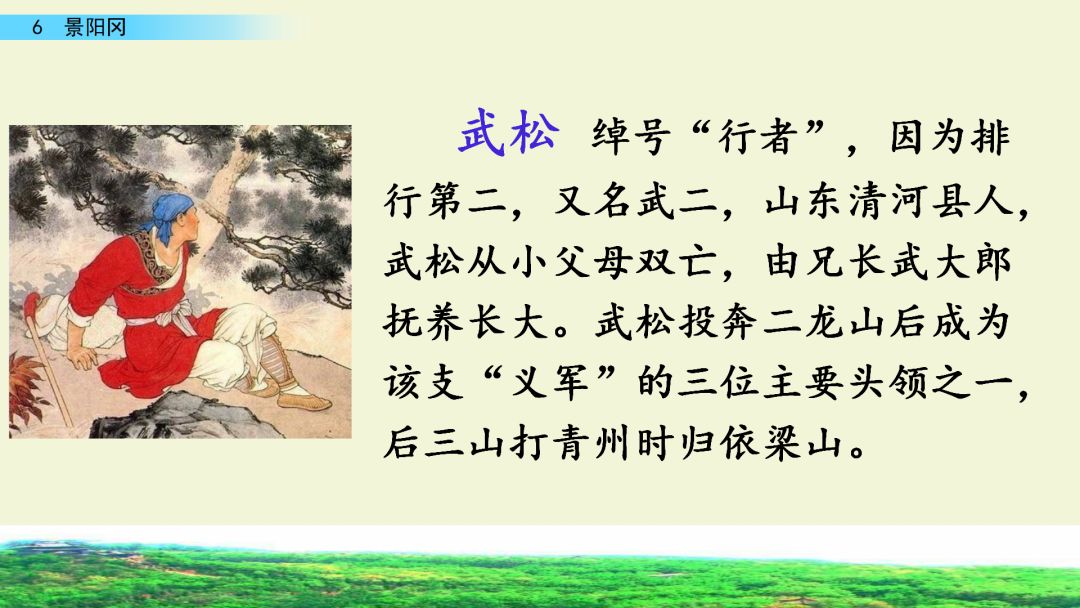 武松 山东清河县人。排行第二,人称“武二郎”。他于景阳冈赤手空拳打死一只老虎,因此远近闻名。在反击官府围剿和攻城夺府的战斗中,他勇敢坚定,是梁山义军的主要将领之一。
