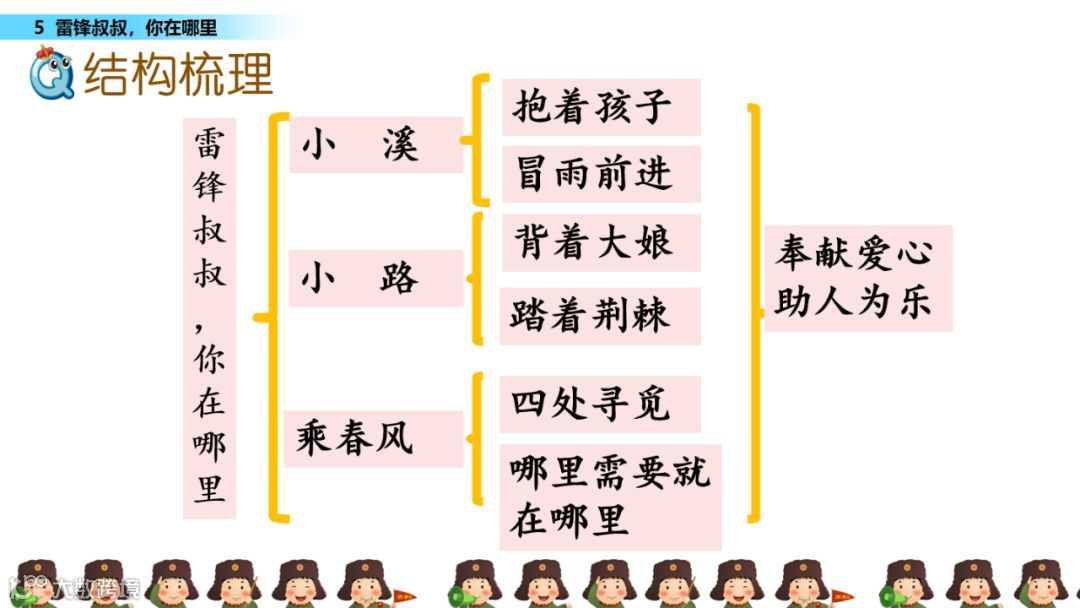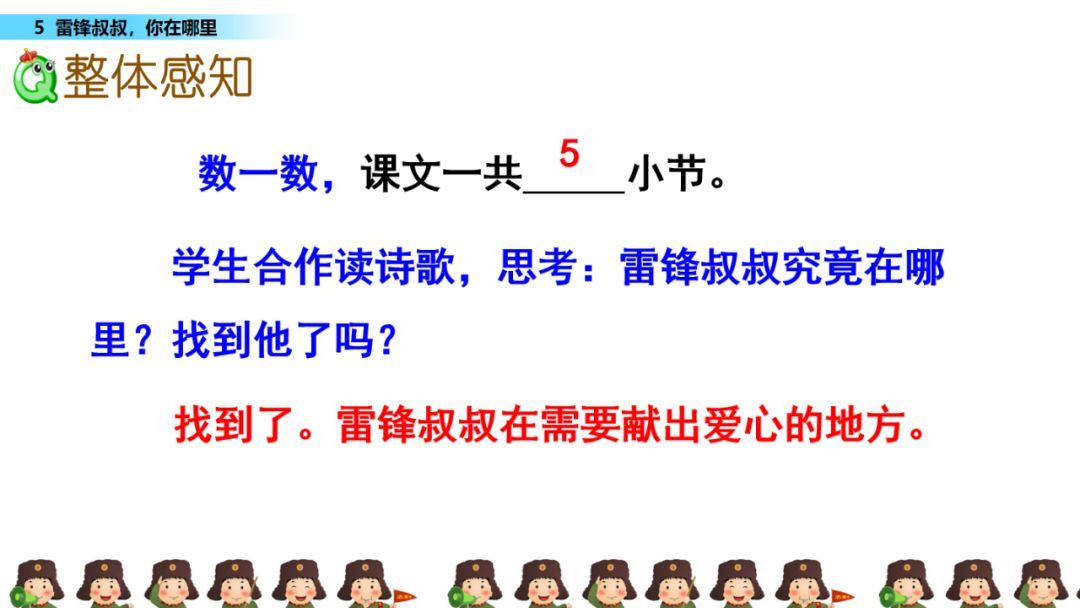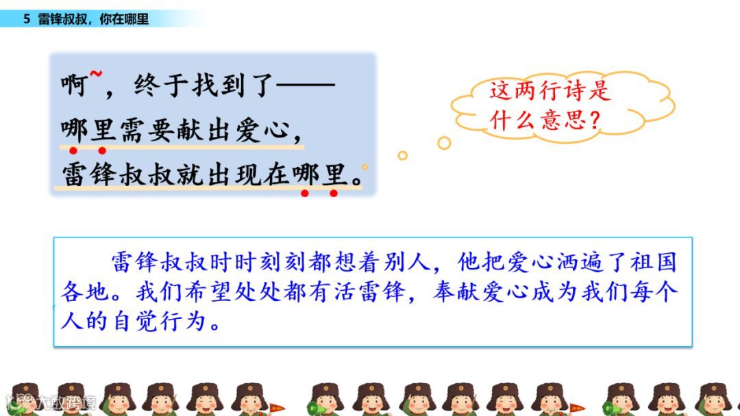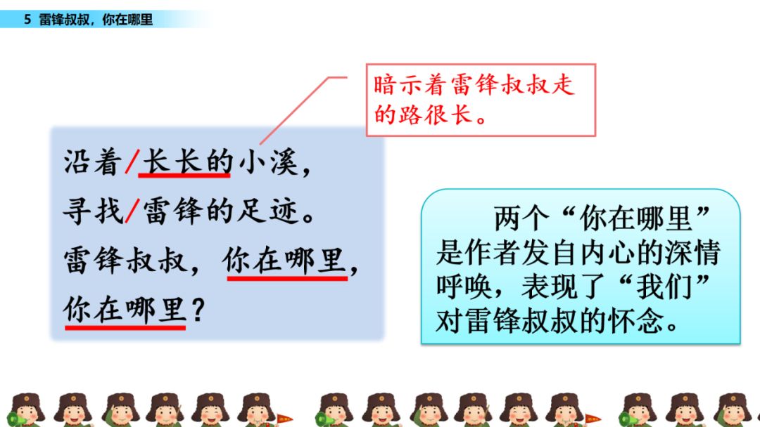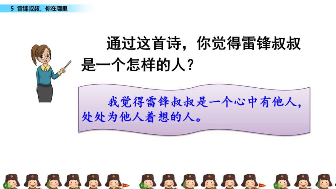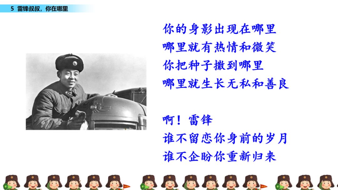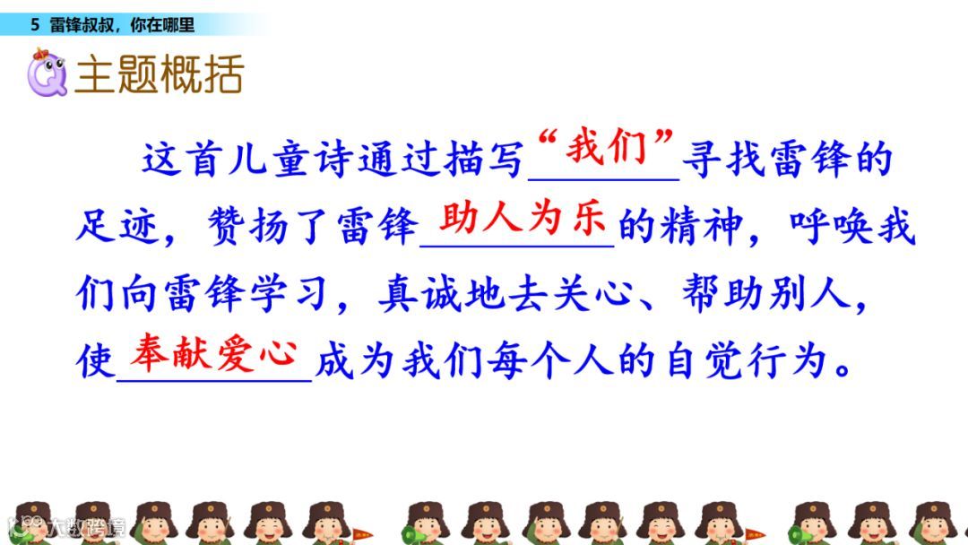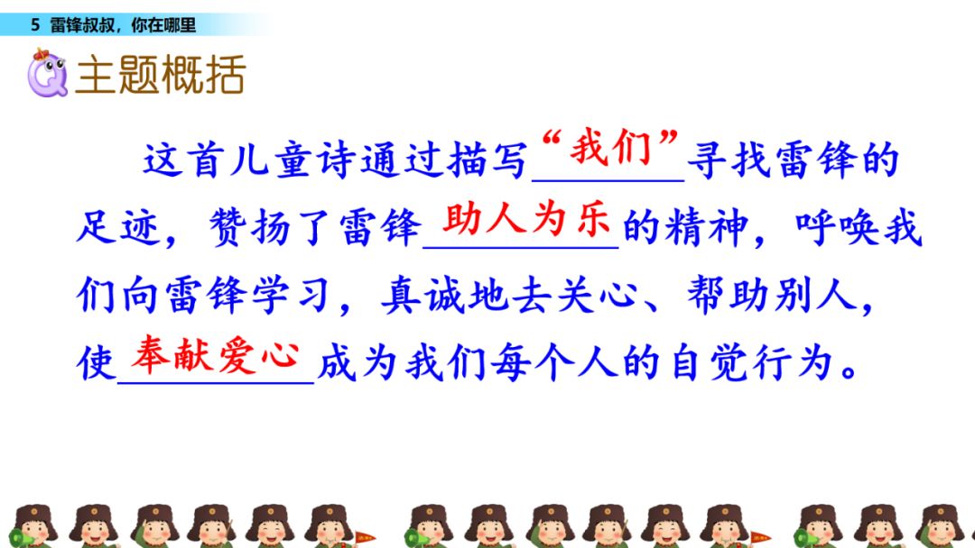这首诗歌讲述了“我们”寻找雷锋叔叔的故事,展现了雷锋叔叔生前做的好事,表现了雷锋叔叔处处想着别人,把爱心洒遍祖国各地的优秀品质,表达了我们对雷锋叔叔的怀念之情,告诉我们要像雷锋一样做一个奉献爱心、乐于助人的人。