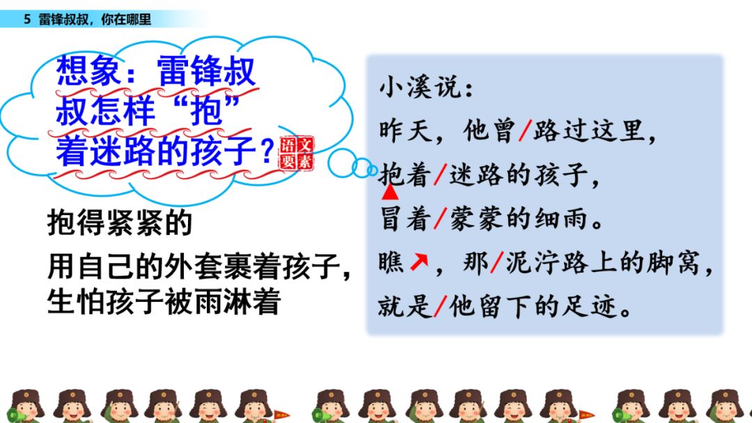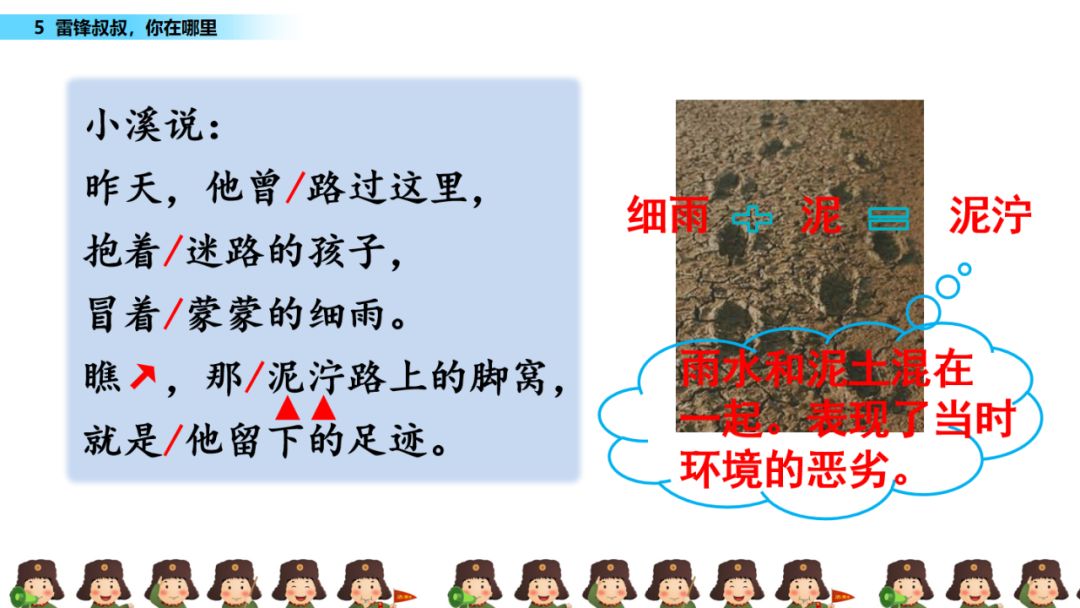 沿着长长的小溪,冒着蒙蒙的细雨,雷锋叔叔在雨中抱着孩子,一步一滑地行走。