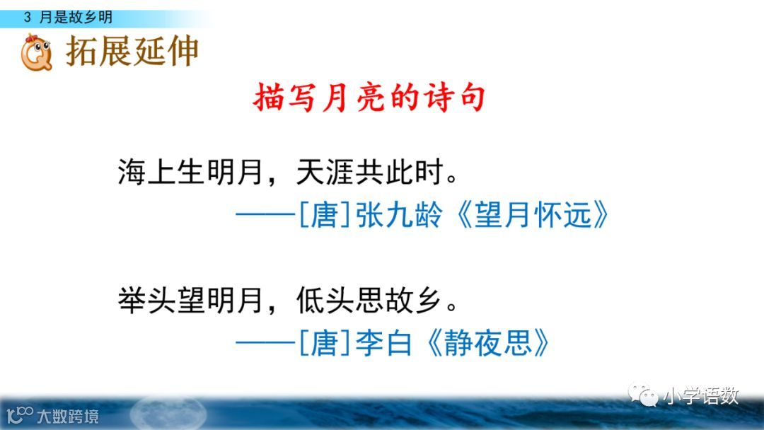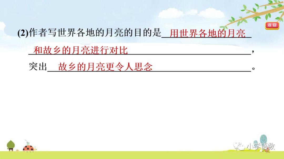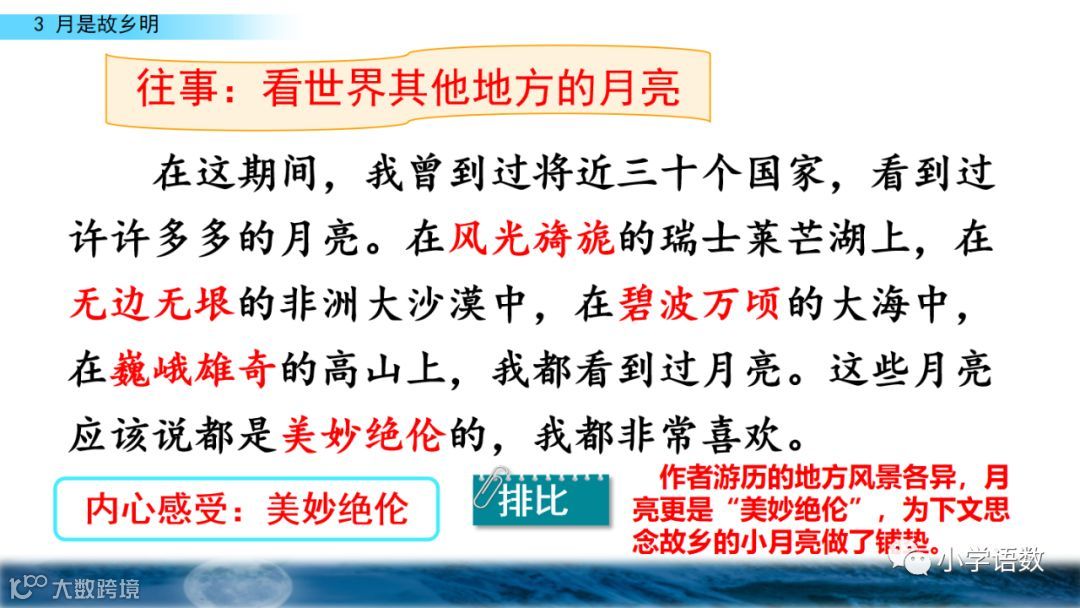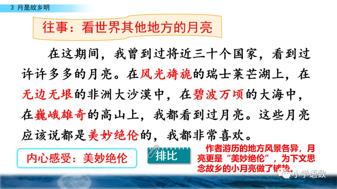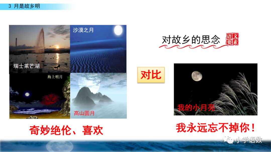 (2)拿世界各地见到的月亮与故乡的月亮作对比,表达对故乡的思念。