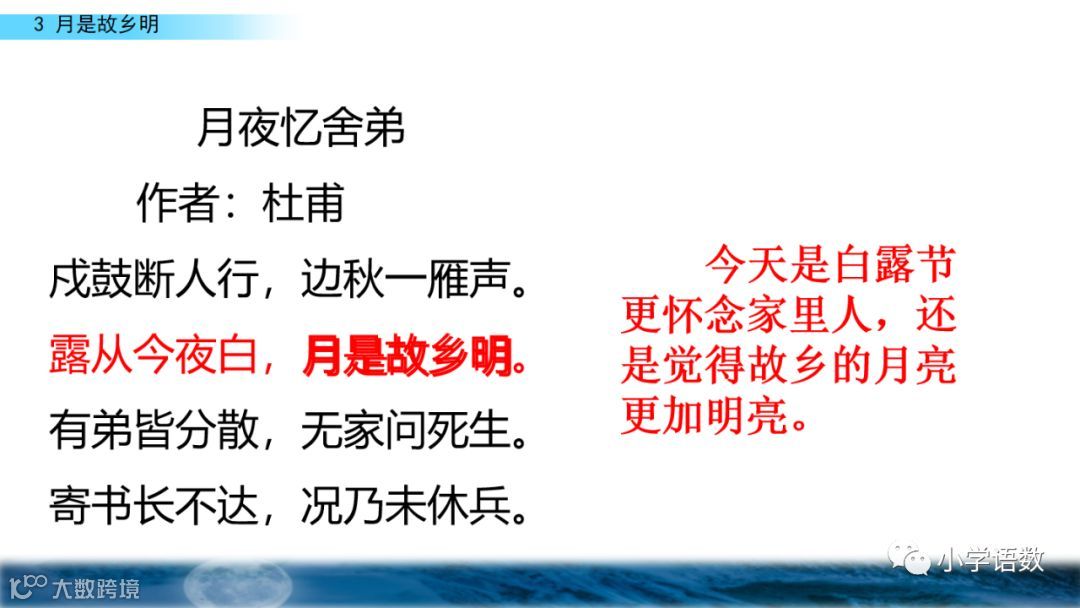 答:①“月是故乡明”出自杜甫的《月夜忆舍弟》。 全诗为:“戍鼓断人行,边秋一雁声。露从今夜白,月是故乡明。有弟皆分散,无家问死生。寄书长不达,况乃未收兵。”