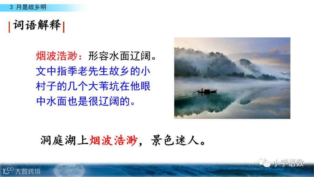 【烟波浩渺】形容江湖水面十分辽阔。烟波:烟雾笼罩的江湖。浩渺;辽阔无边。