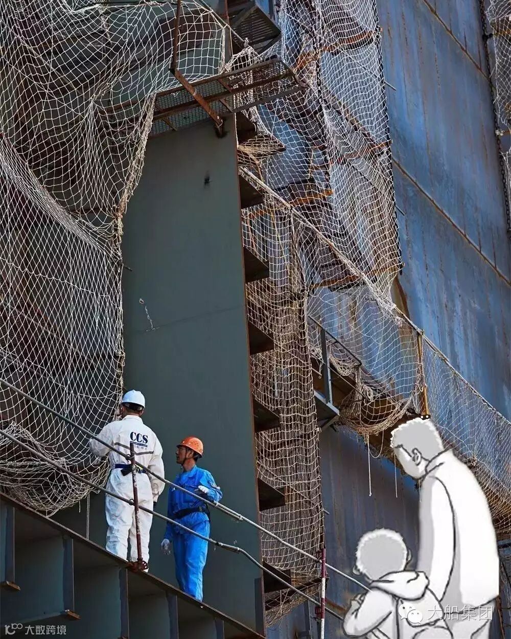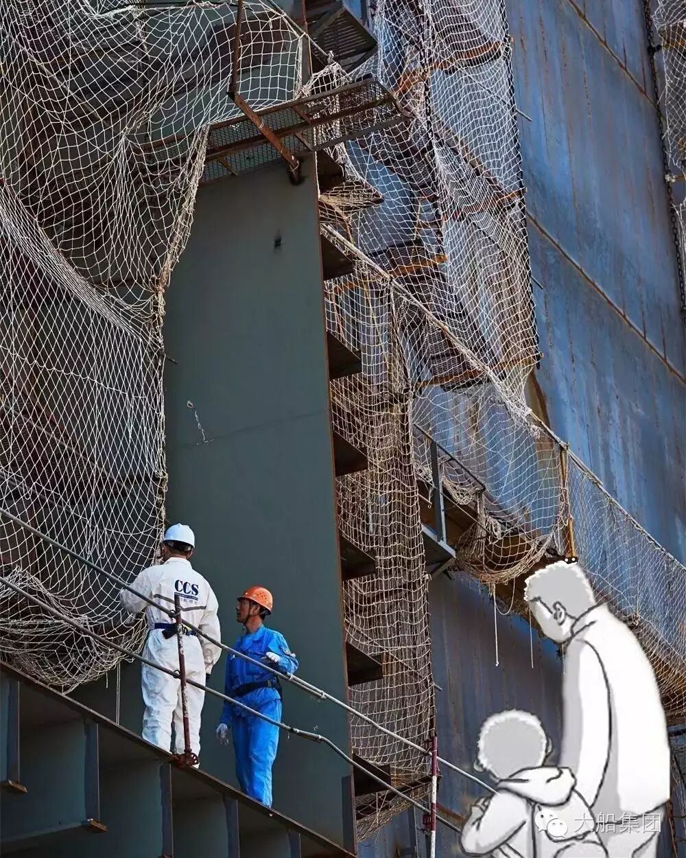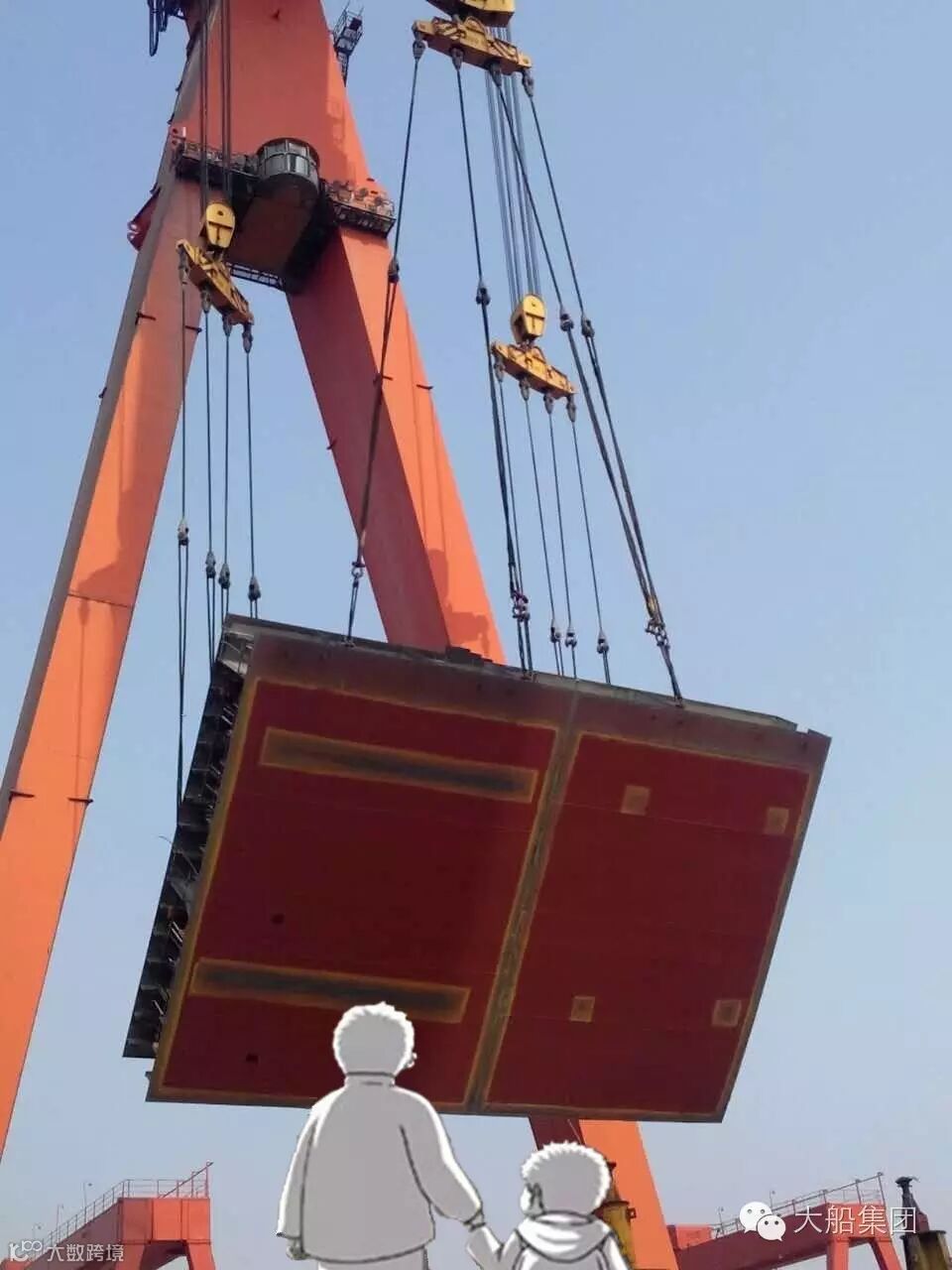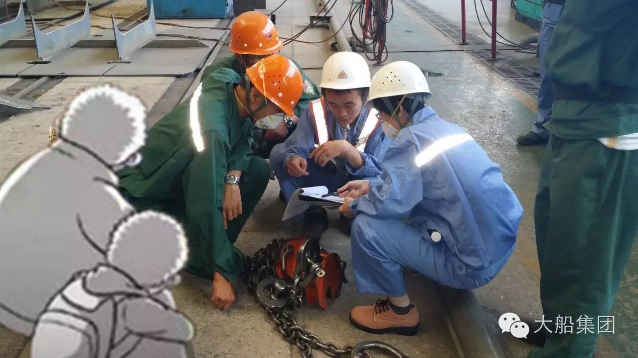 “孩子,叔叔在检验船体质量呢。在船厂里,这样的高空作业活动还很多哦。”