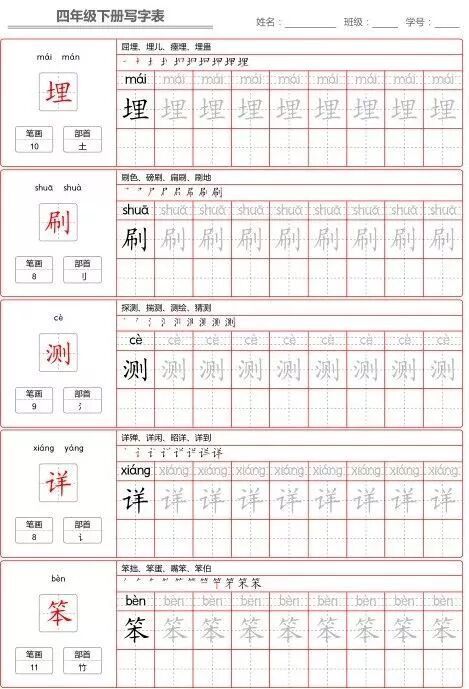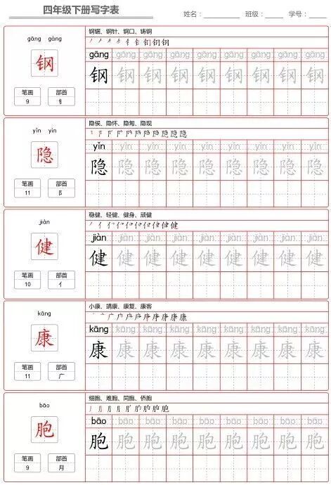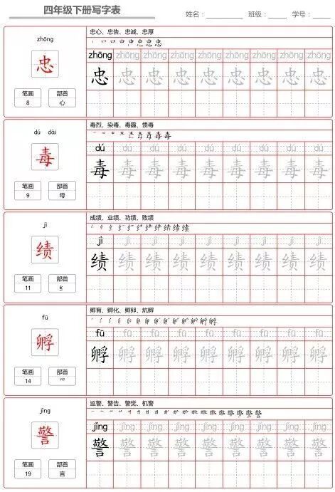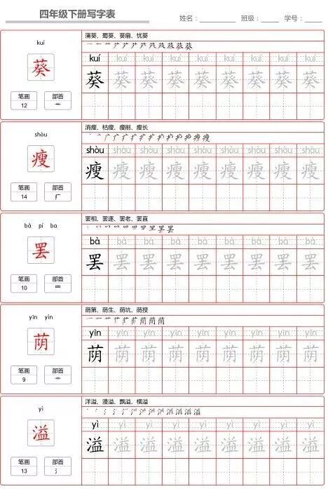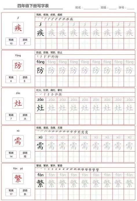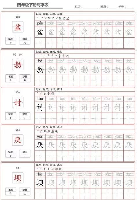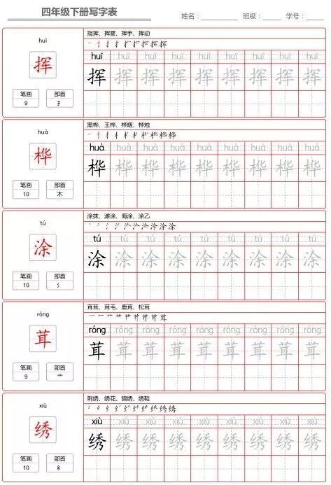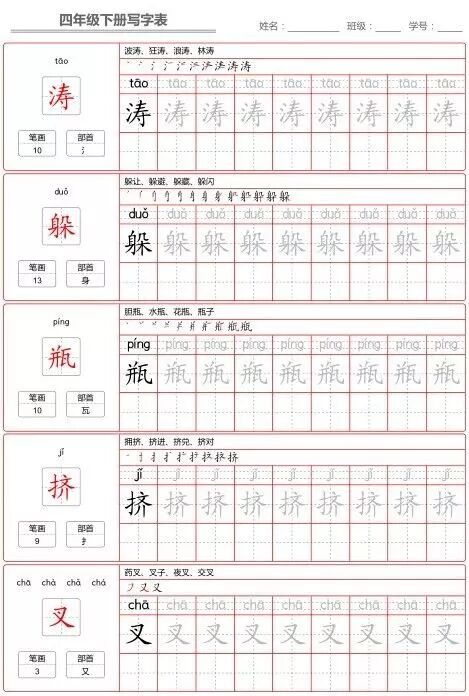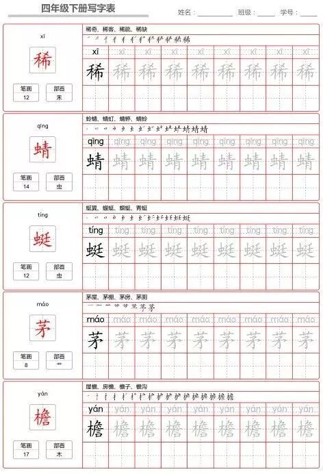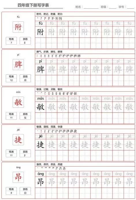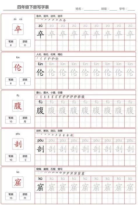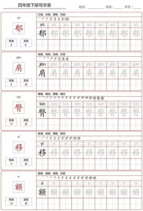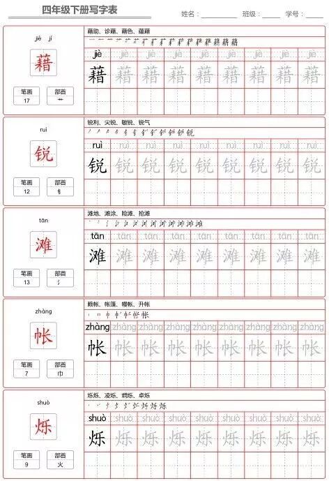 同步字帖┃部编版四年级语文下册:写字表练字贴