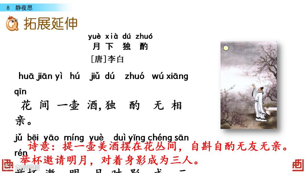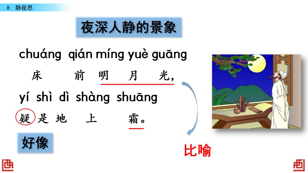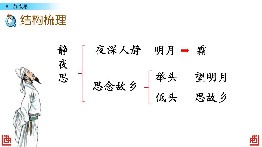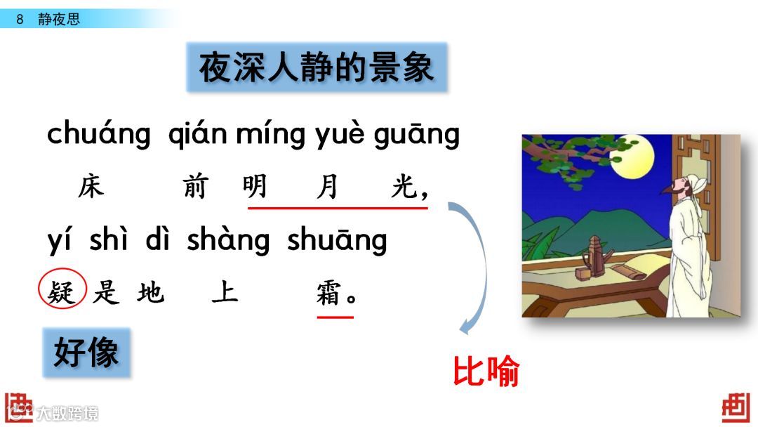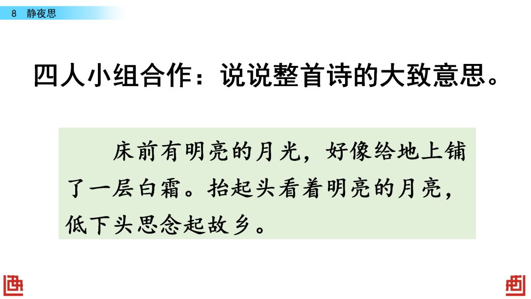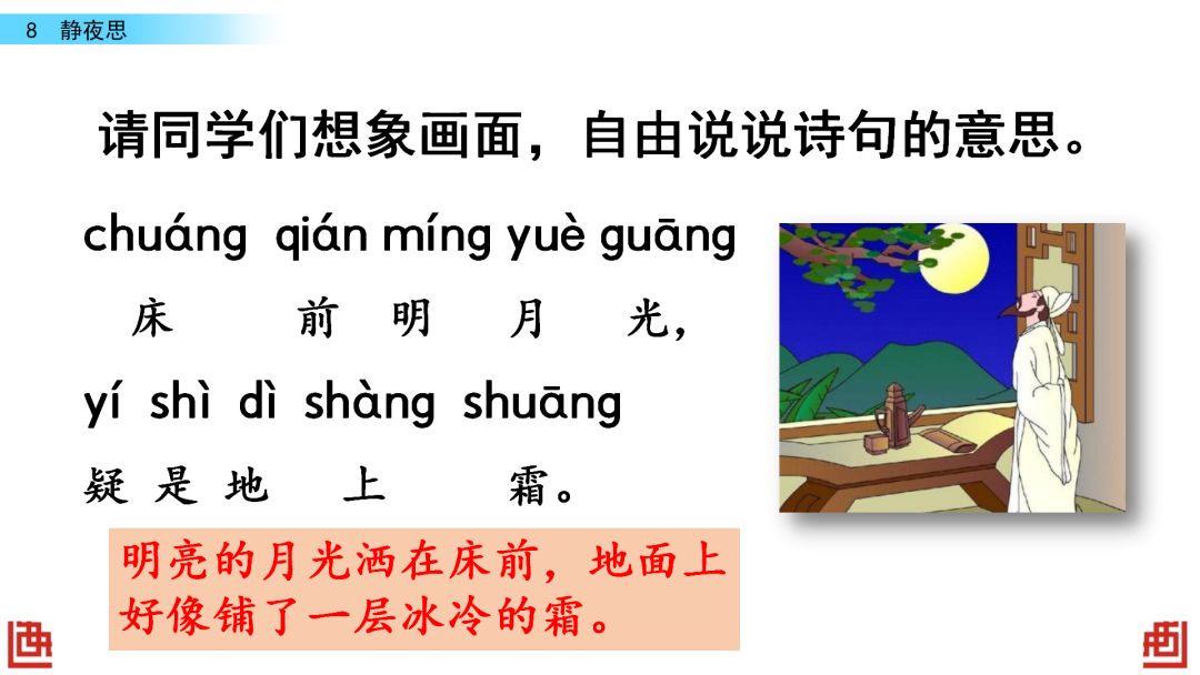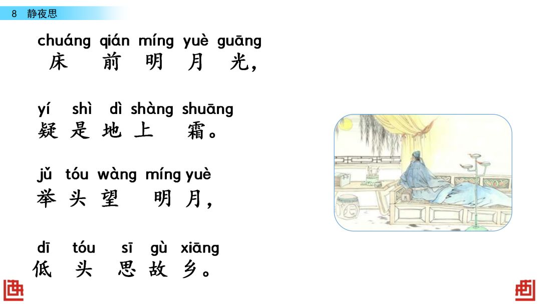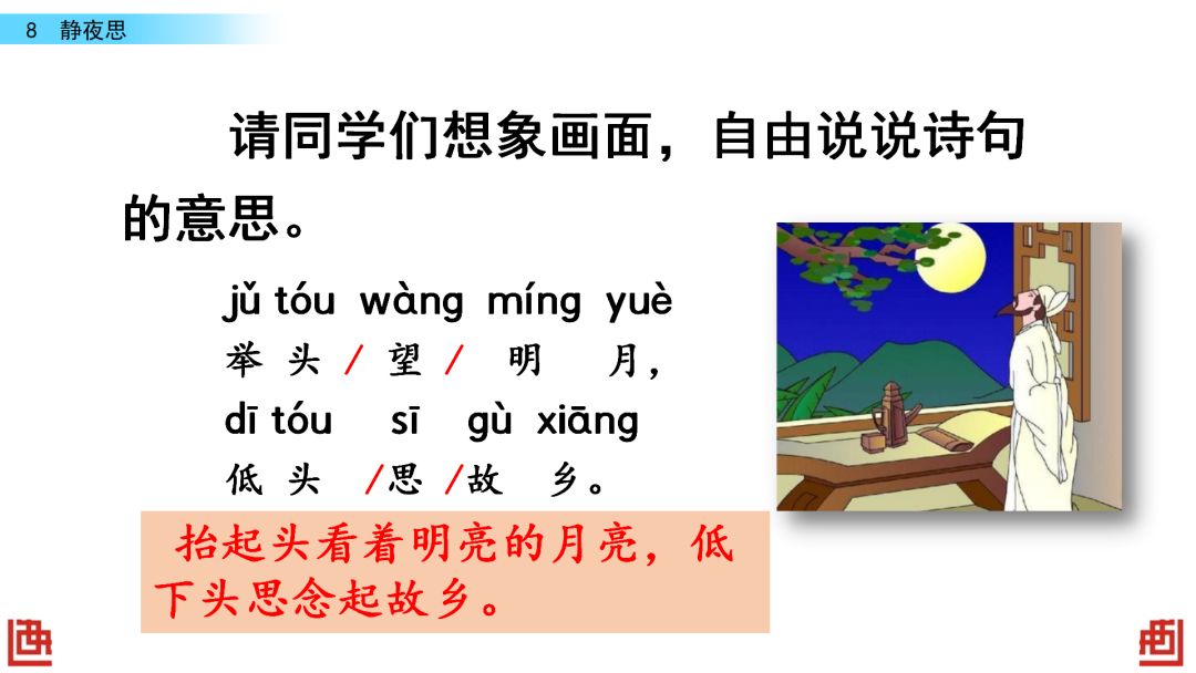 诗意:银白色的月光照在床前,好像地上下了白霜。抬起头来望着高高挂在天空的明月,便不由得低下头思念起故乡来。