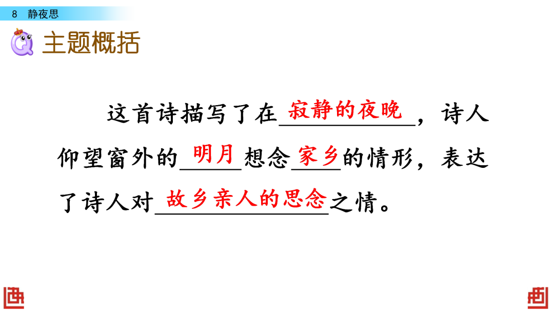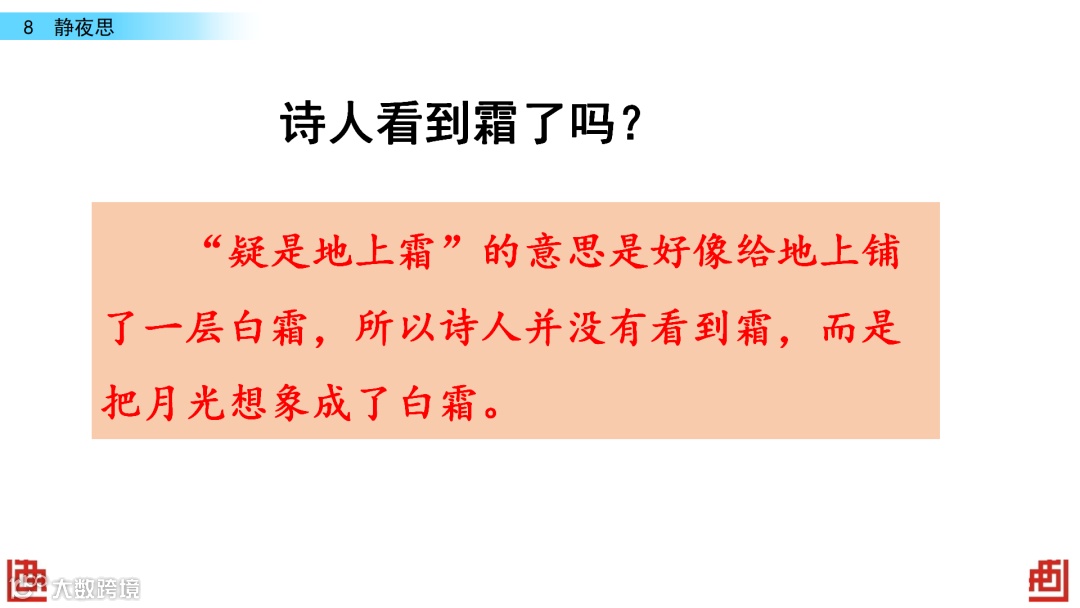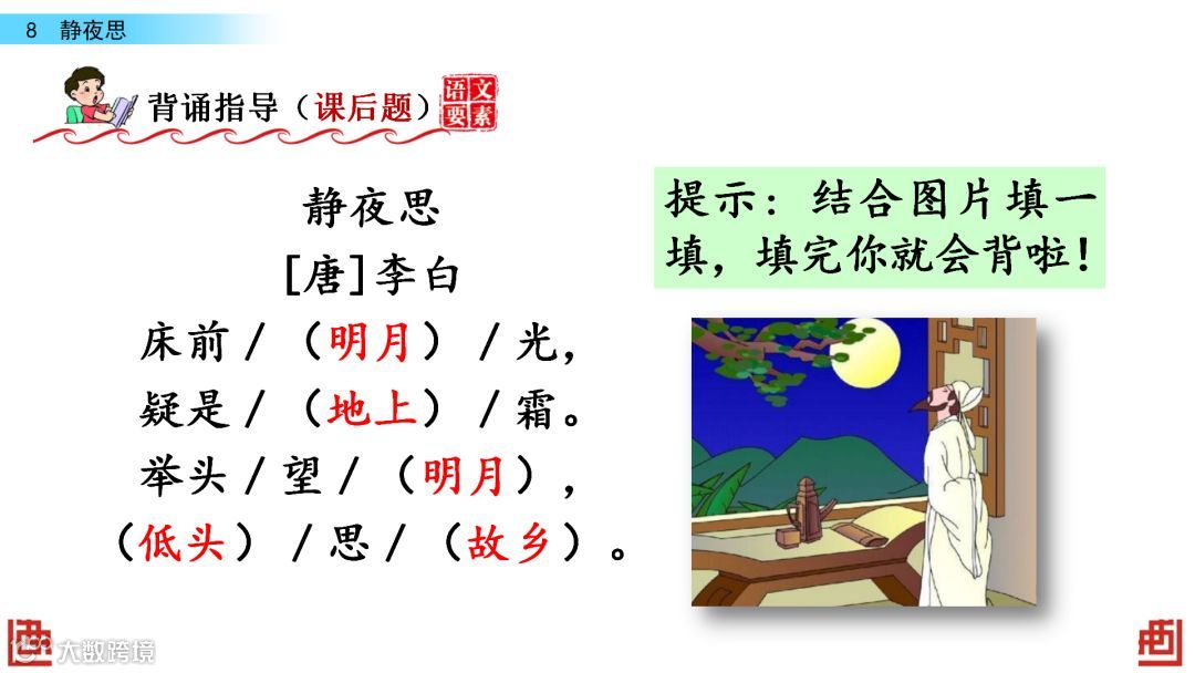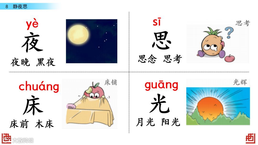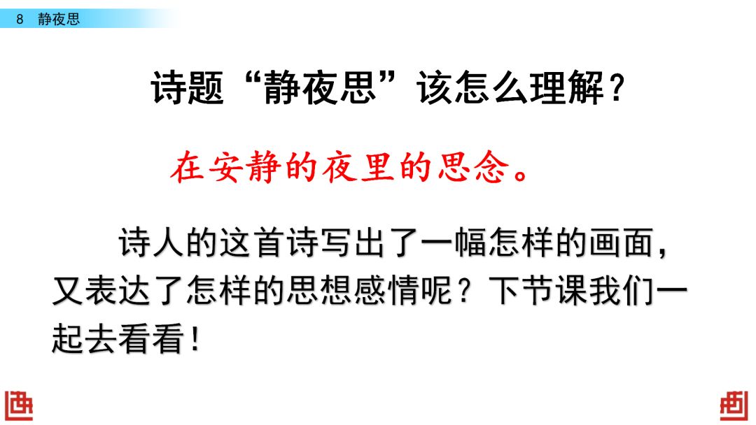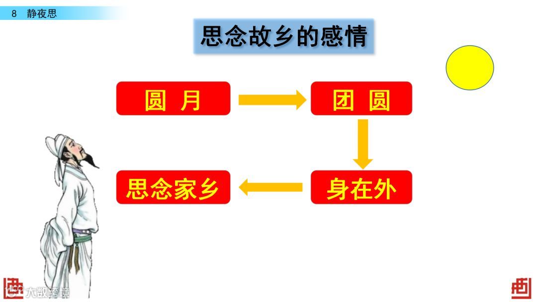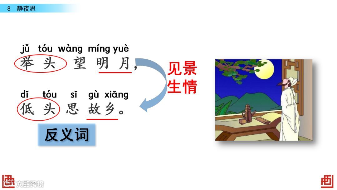 诗意:银白色的月光照在床前,好像地上下了白霜。抬起头来望着高高挂在天空的明月,便不由得低下头思念起故乡来。