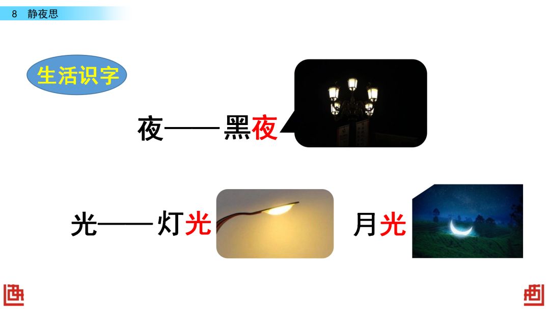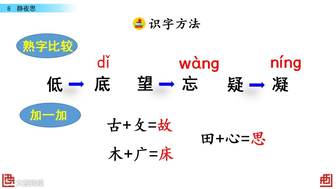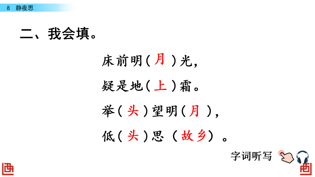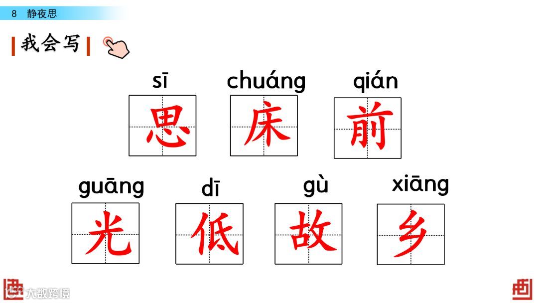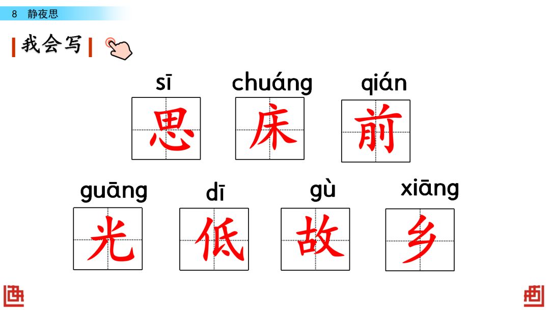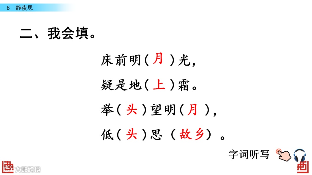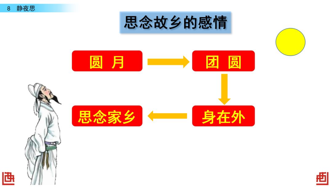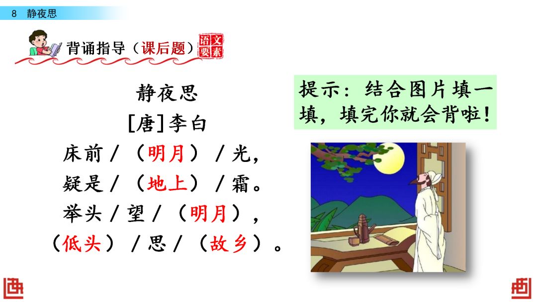 诗意:银白色的月光照在床前,好像地上下了白霜。抬起头来望着高高挂在天空的明月,便不由得低下头思念起故乡来。