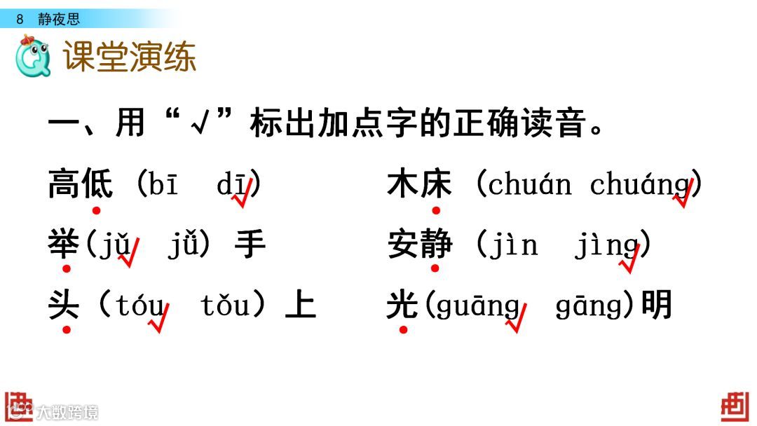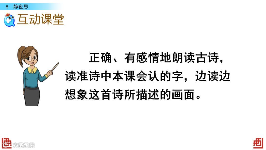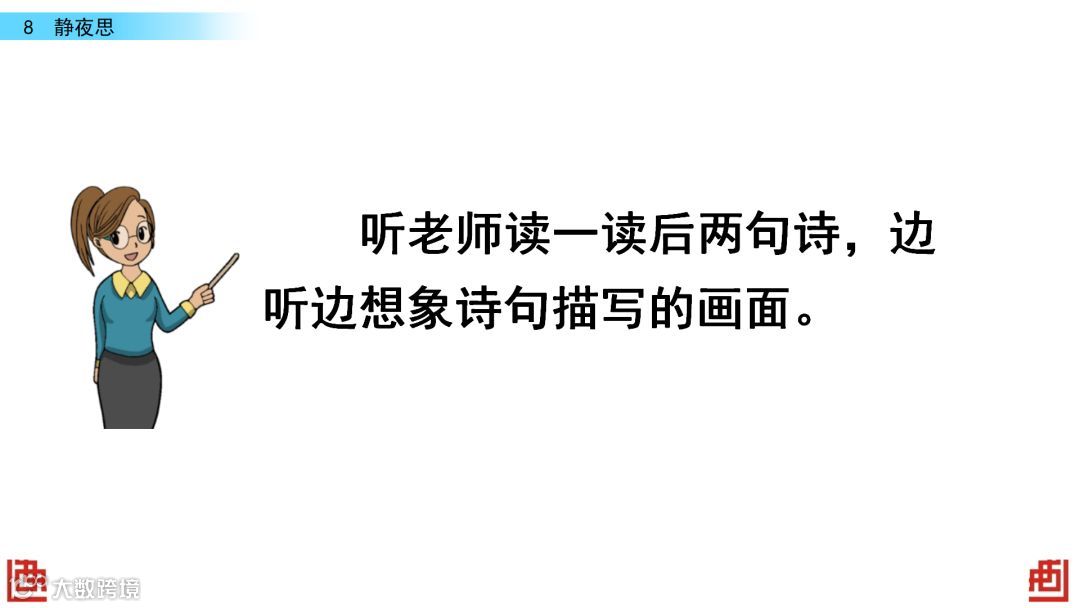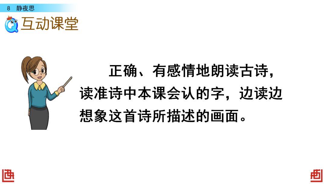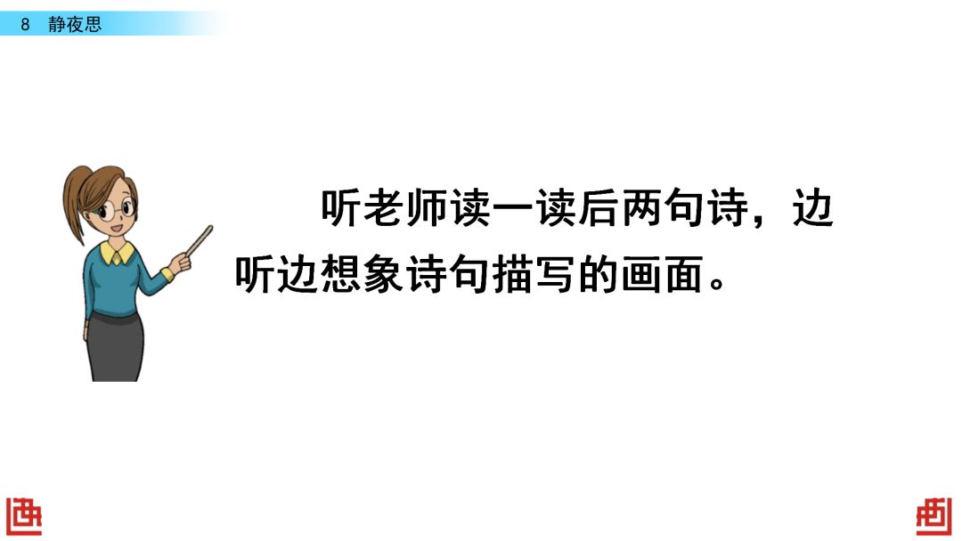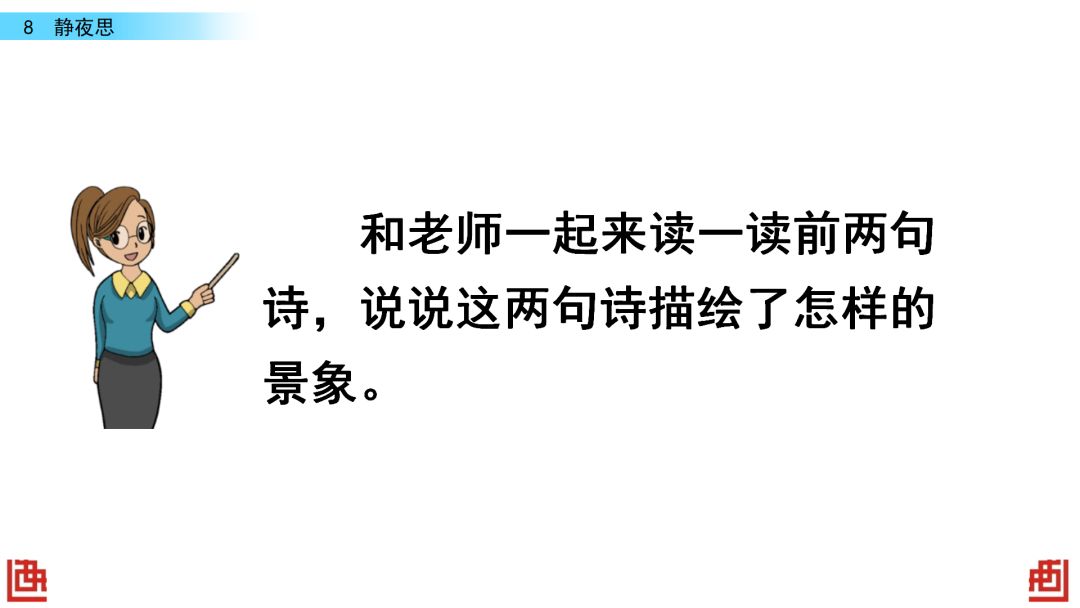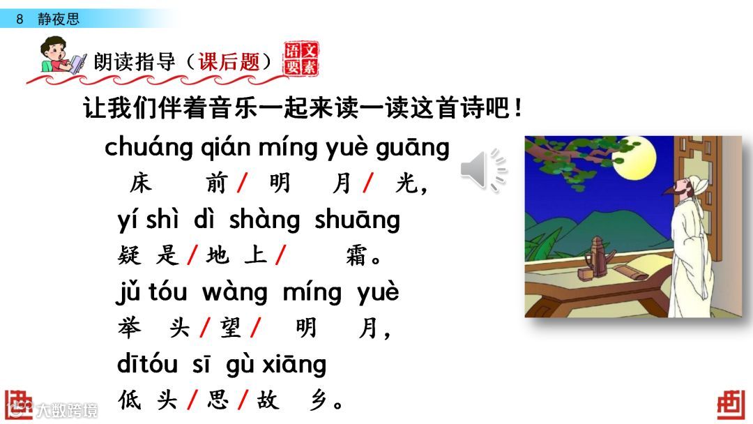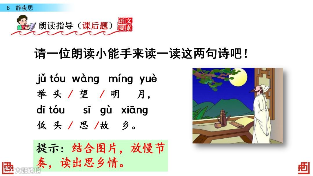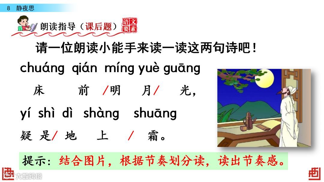朗读古诗时,首先读正确,读得一字不差,而且读出古诗的韵律。如朗读节奏: