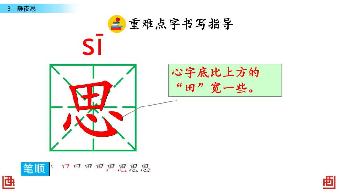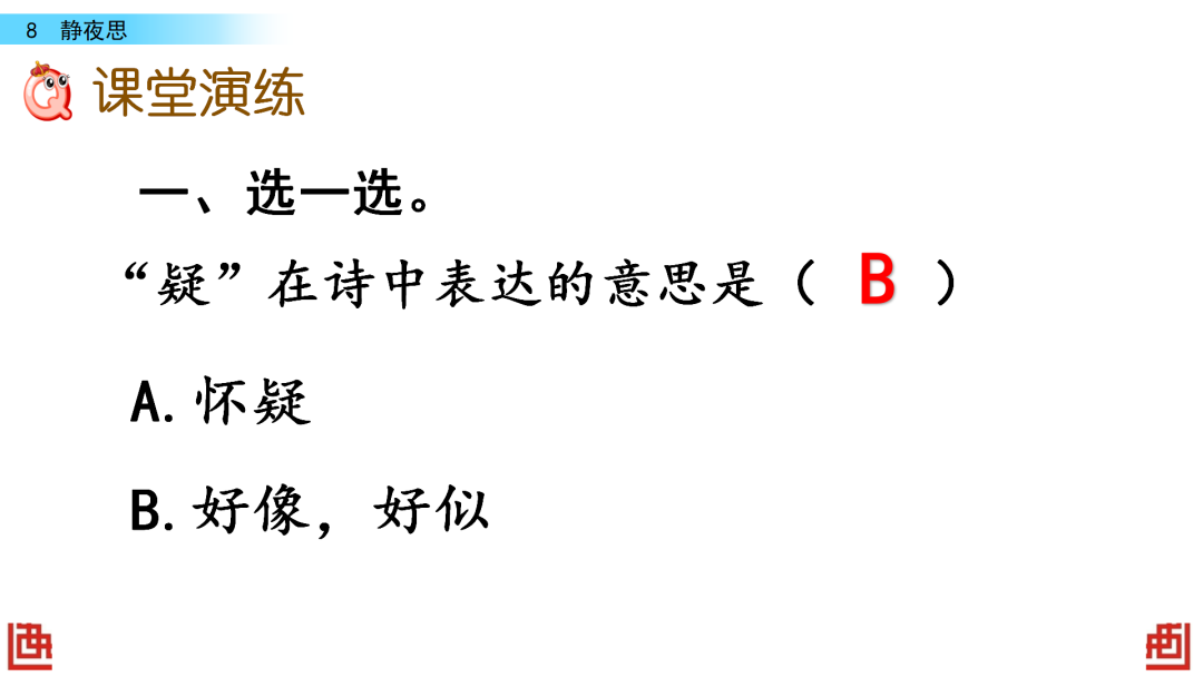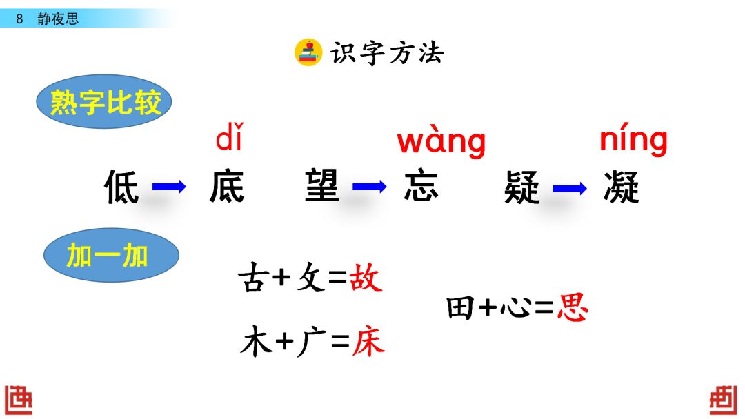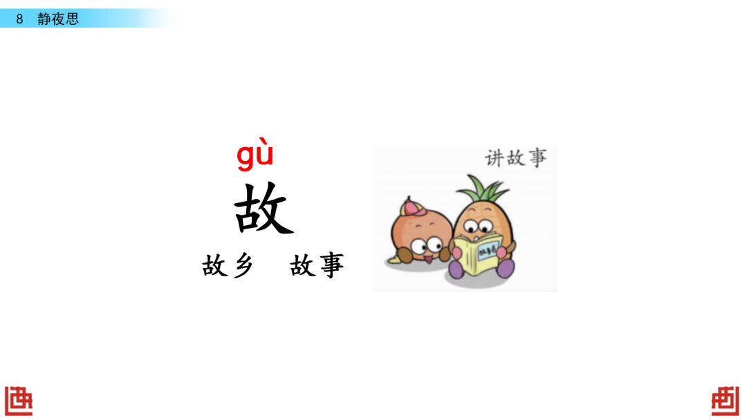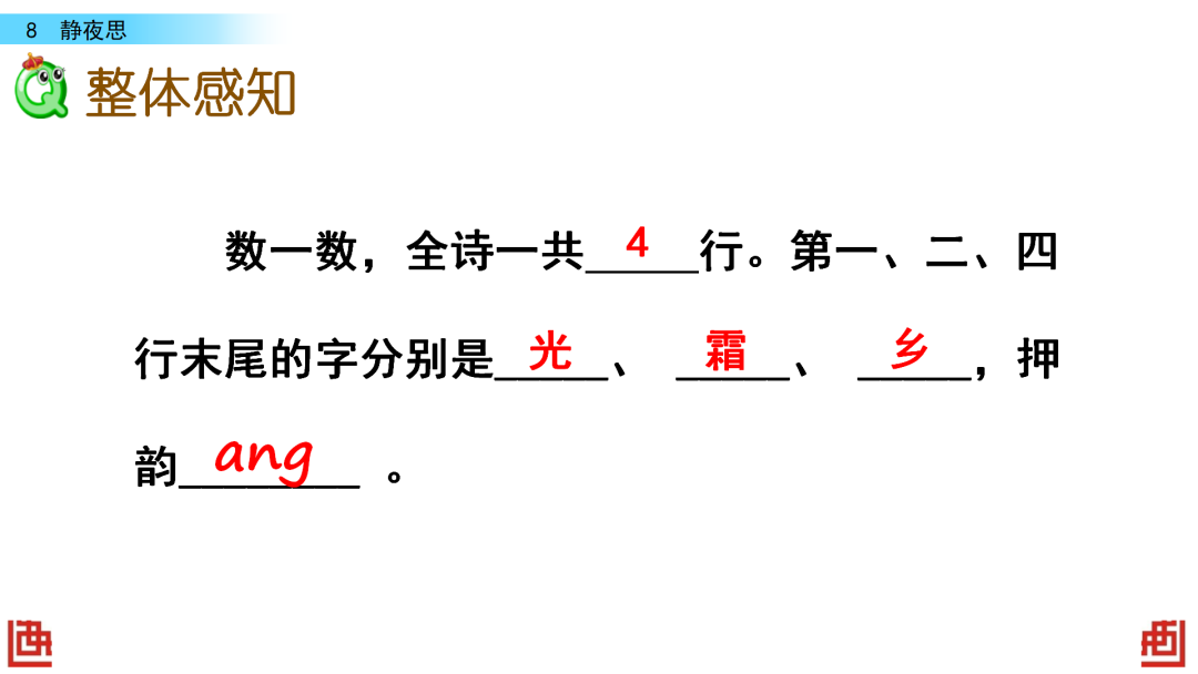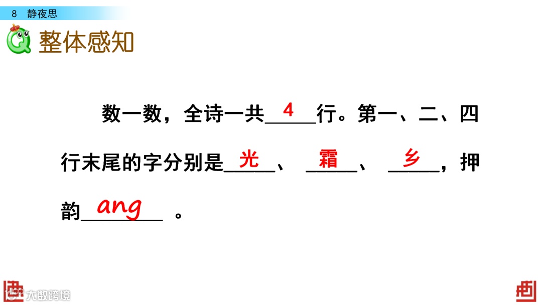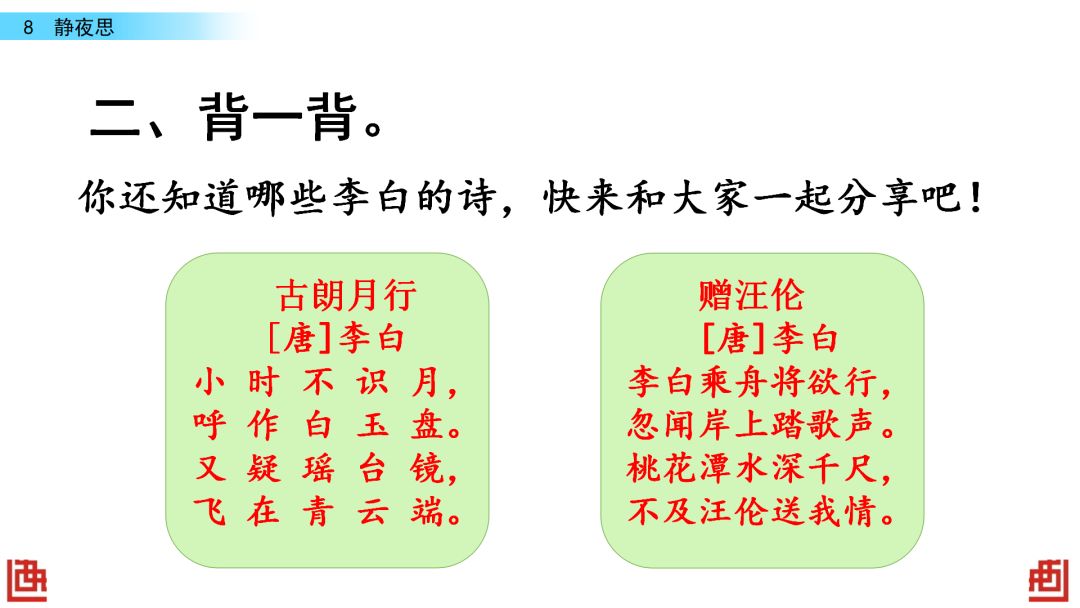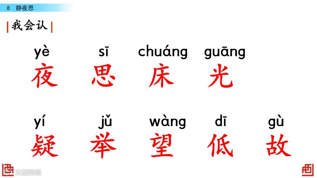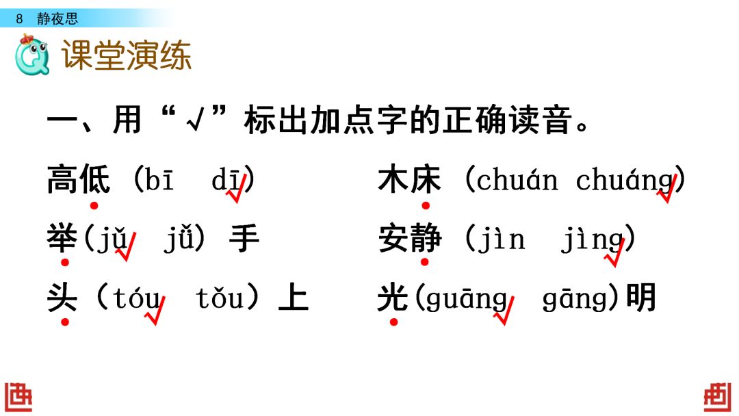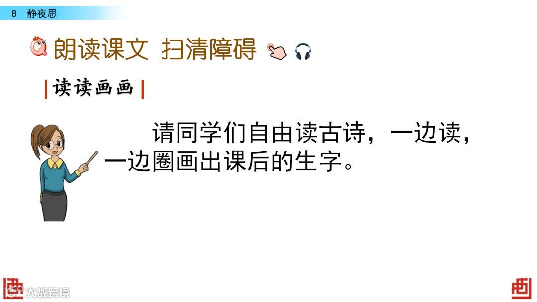 朗读古诗时,首先读正确,读得一字不差,而且读出古诗的韵律。如朗读节奏: