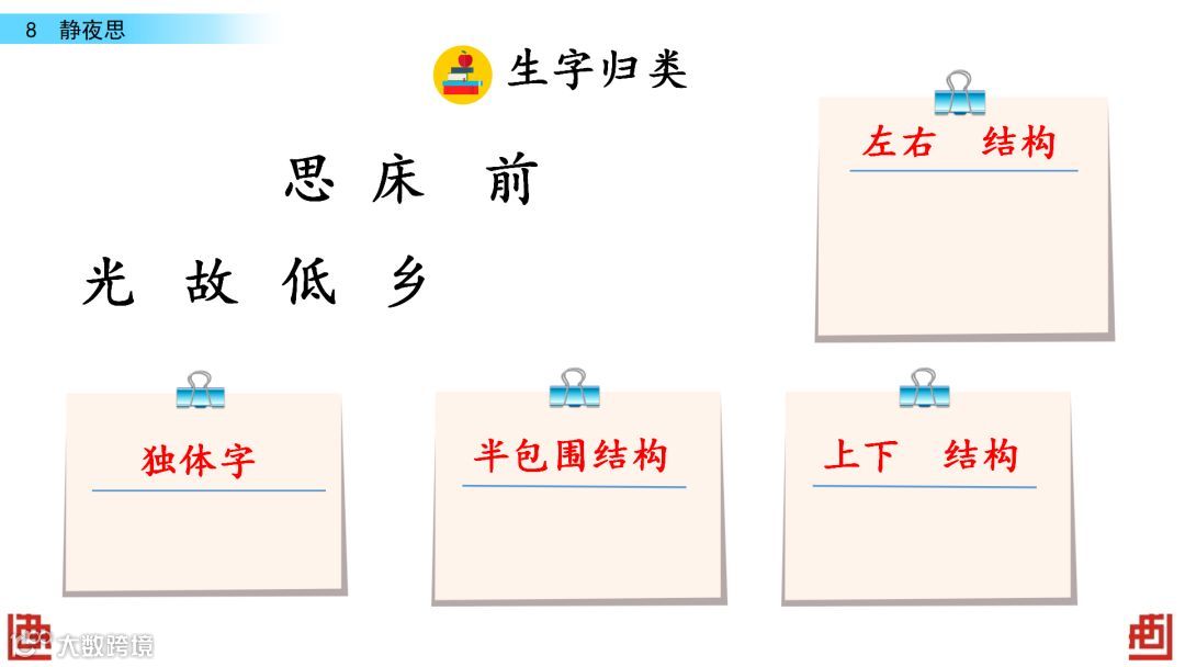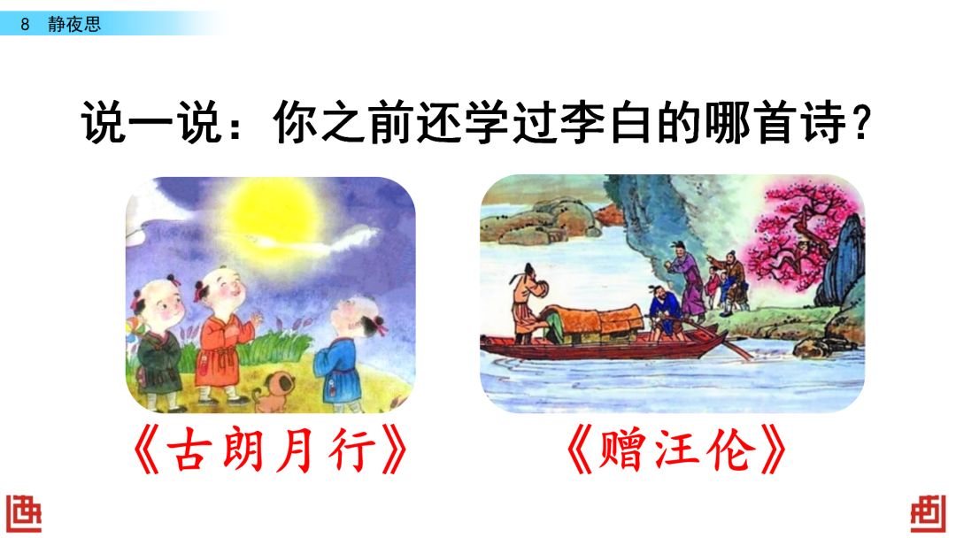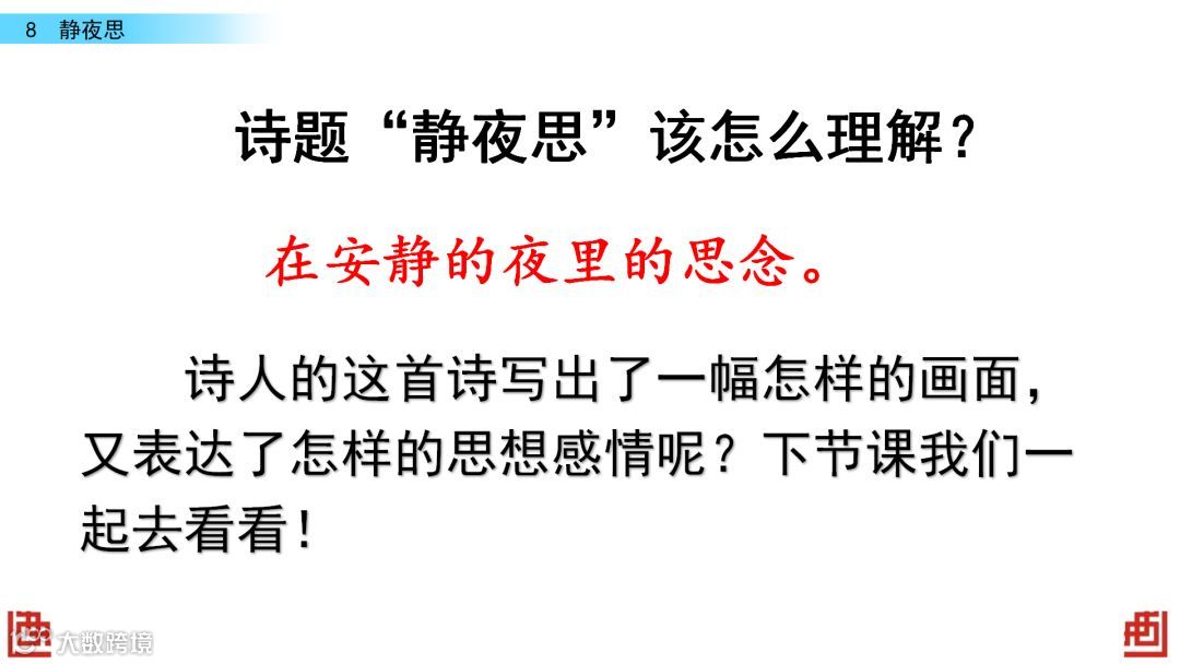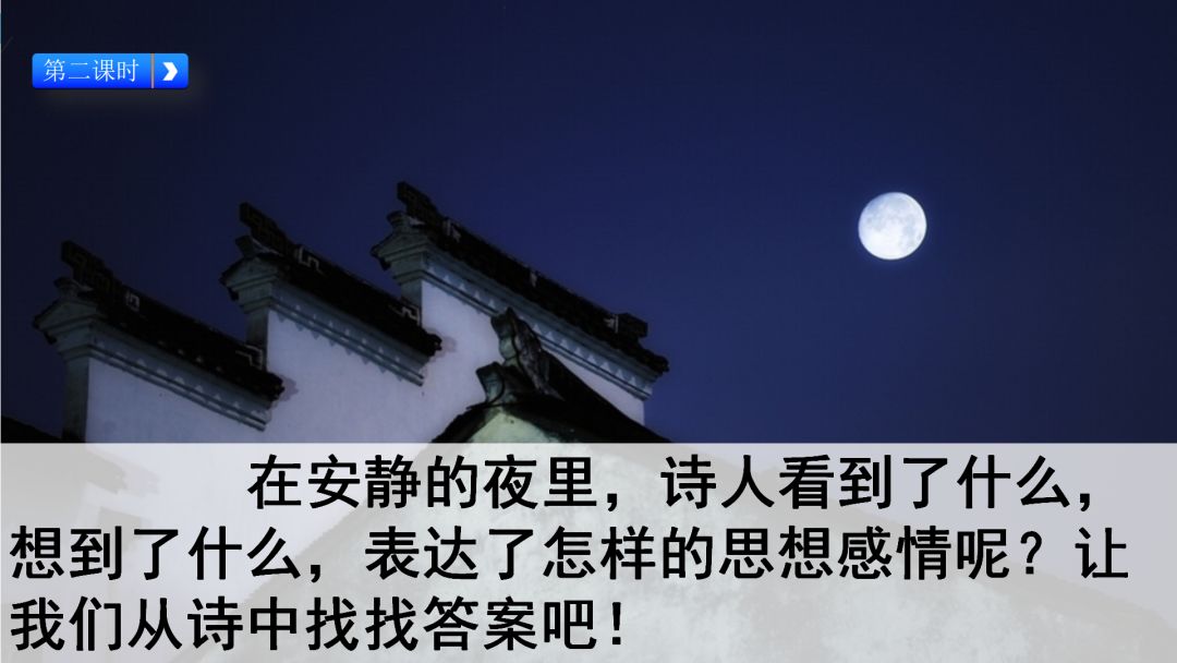 《静夜思》是唐代诗人李白所作的一首五言古诗。此诗描写了秋日夜晚,诗人于屋内抬头望月的所感。诗中运用比喻、衬托等手法,表达客居思乡之情。