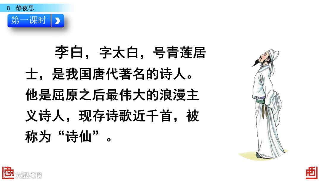 李白(701—762),字太白,号青莲居士,是我国唐代著名的诗人。他的诗想象丰富而奇特,风格飘逸而豪放自然,是屈原之后最伟大的浪漫主义诗人,素有“诗仙”的美名。他与杜甫齐名,合称“李杜”。主要作品:《蜀道难》《行路难》《梦游天姥吟留别》等。