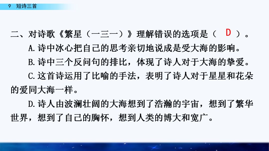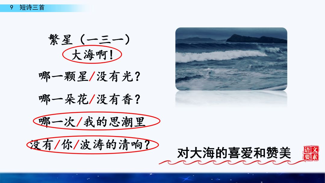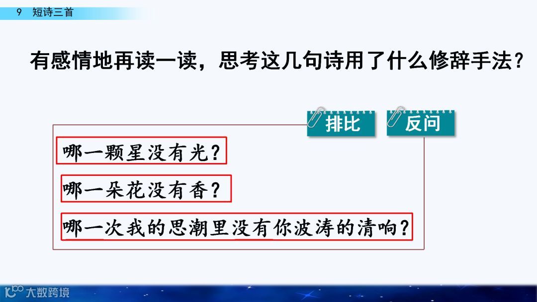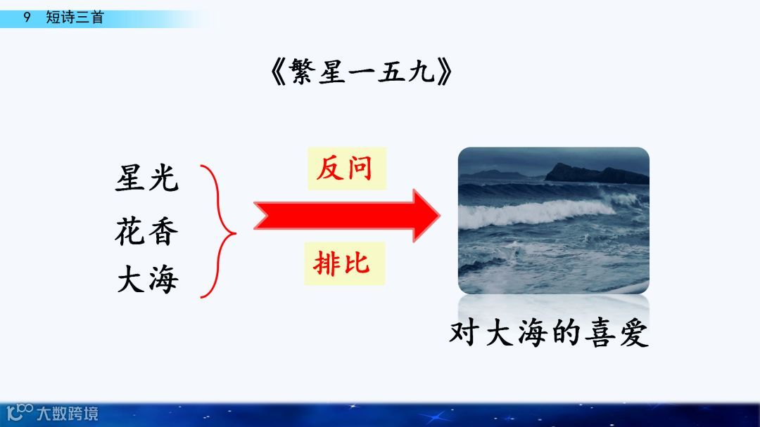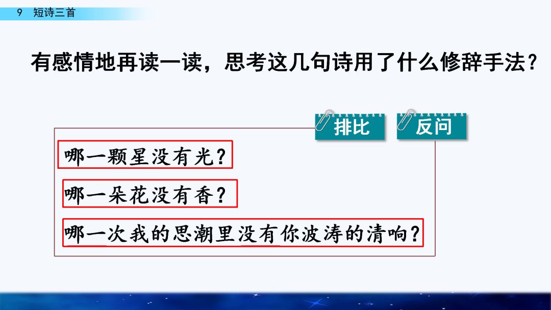 《繁星(一三一)》:用排比、反问的形式,表达了诗人对波澜壮阔的大海的赞颂。
