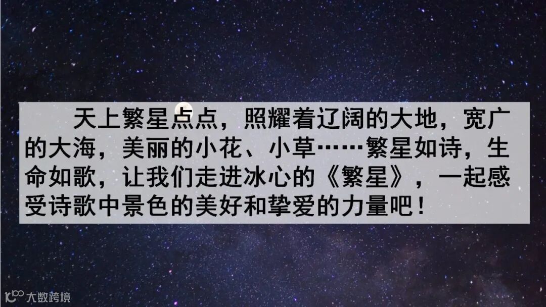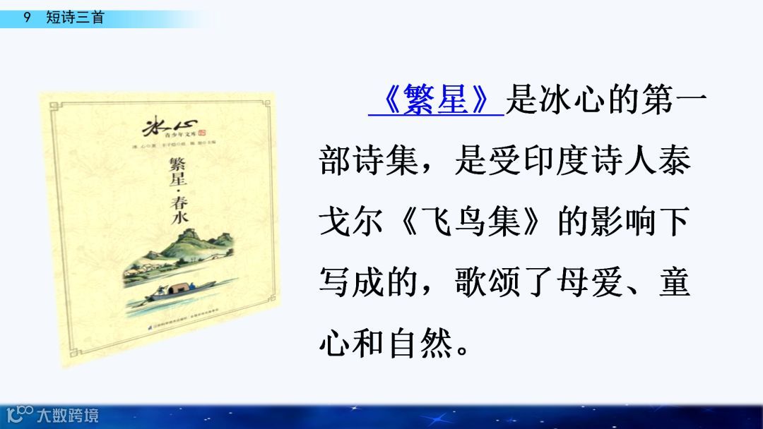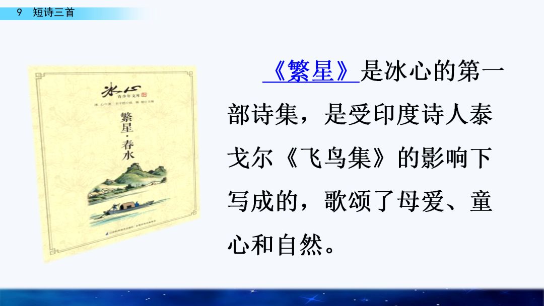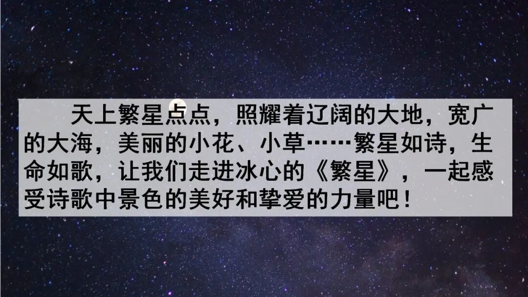 《繁星》是冰心在印度诗人泰戈尔《飞鸟集》的影响下写成的,是将一些“零碎的思想”收集在一个诗集里。总的来说,它大致包括三方面的内容:一是对母爱与童真的歌颂与赞扬;二是对大自然的崇拜与赞颂;三是对人生的感悟和思考。在艺术上,冰心以童心关照一切,诗歌美在清纯,美在朦胧,美在含蓄。