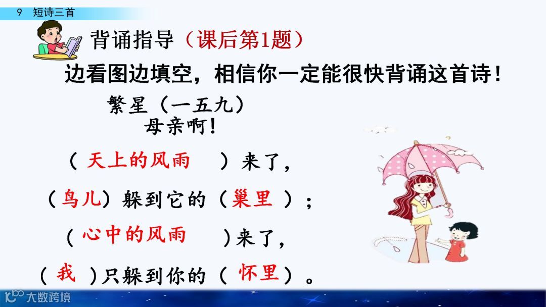 这首诗运用类比、比喻的手法,用“鸟儿”类比自己,用“心中的凤雨”比喻生活中的困难、挫折、烦恼、忧愁等,形象生动地写出了母亲对儿女的保护和关爱。