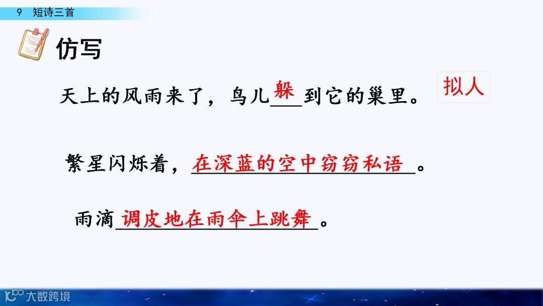 二、1.鸟儿躲到它的巢里,我只躲到你的怀里。