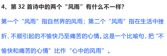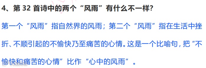 第一个“风雨”指自然界的风雨;第二个“风雨”指在生活中挫折、不顺引起的不愉快乃至痛苦的心情。这是一个比喻句,把“不愉快和痛苦的心情”比作“心中的风雨"。