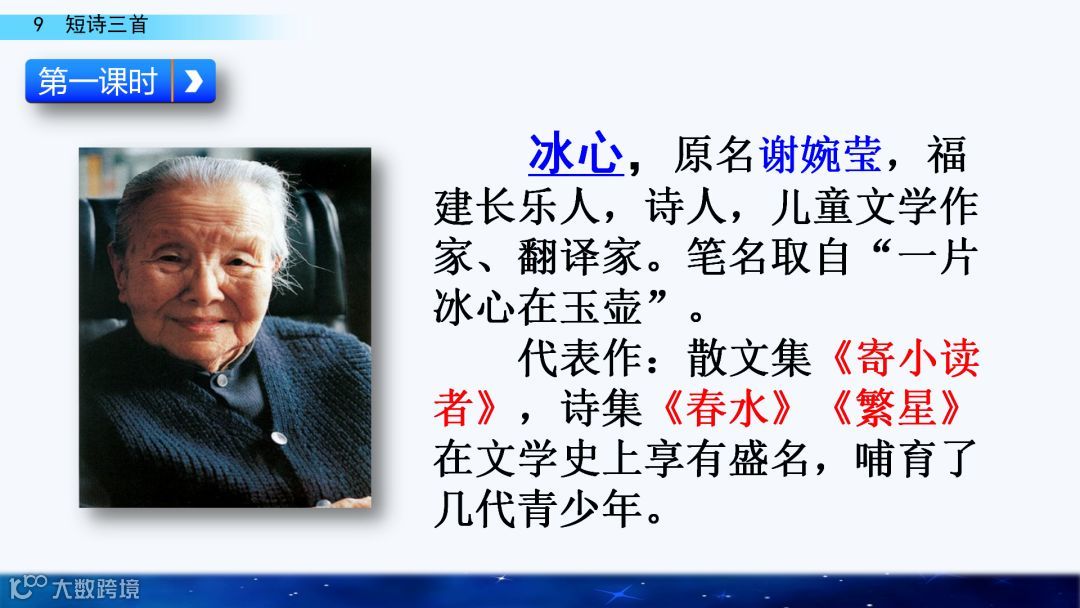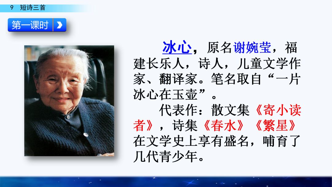 冰心,原名 ,福建长乐人。中国诗人, (年代)作家,翻译家,儿童文学作家,散文家,社会活动家。笔名冰心取自“ ”。