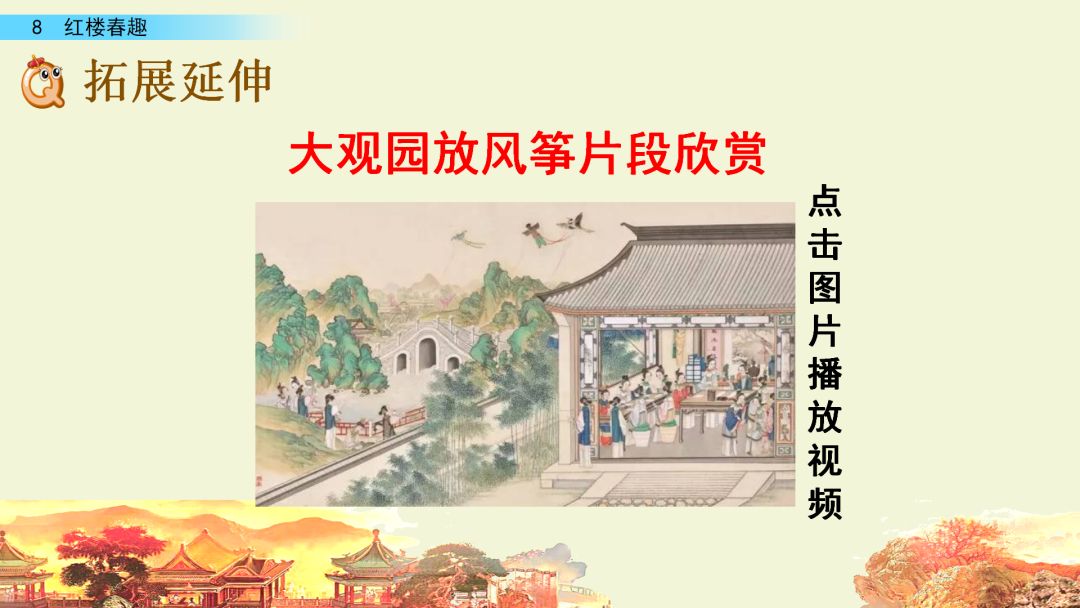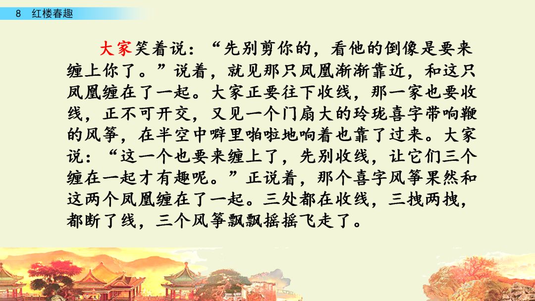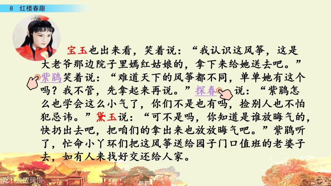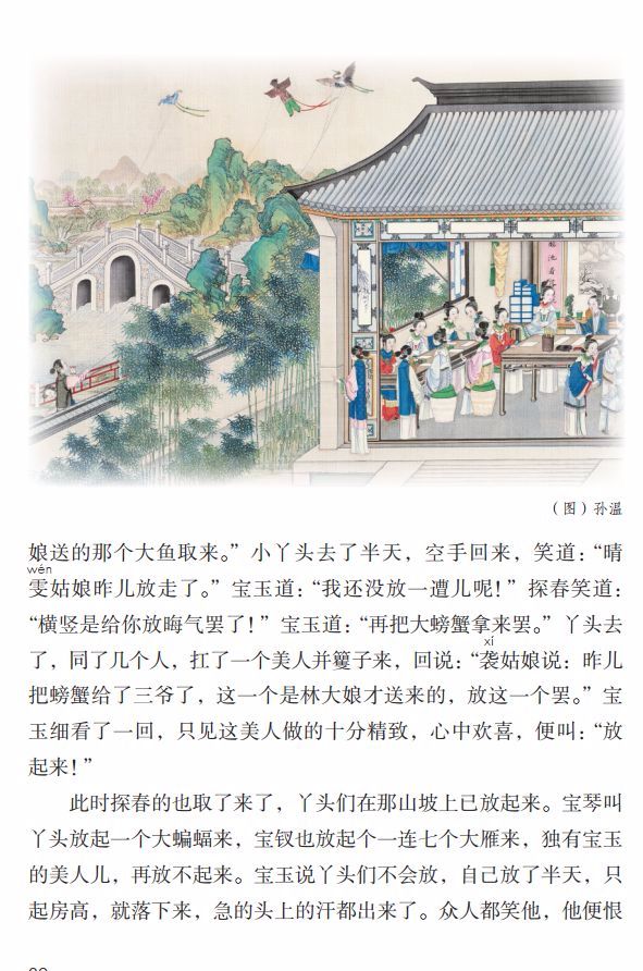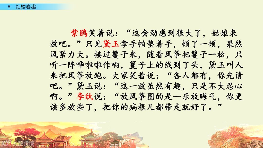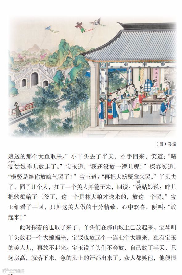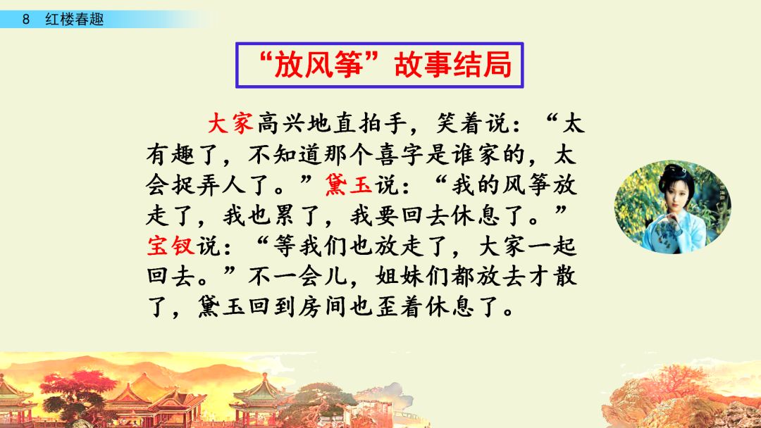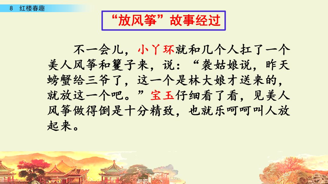 (1)黛玉提议放风筝,小丫头们急忙七手八脚地去拿风筝,准备放风筝的工具。