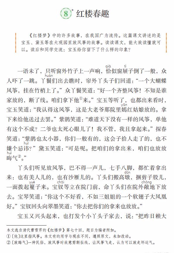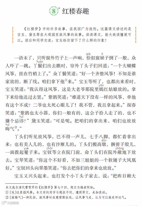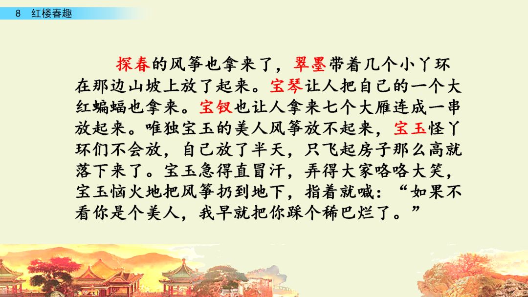 3、宝玉说丫头们不会放, 自己放了半天,只起房高,便落下来了。急的宝玉头上出汗,众人又笑。宝玉恨的掷在地下,指着风筝道:“若不是个美人,我一顿脚跺个稀烂。