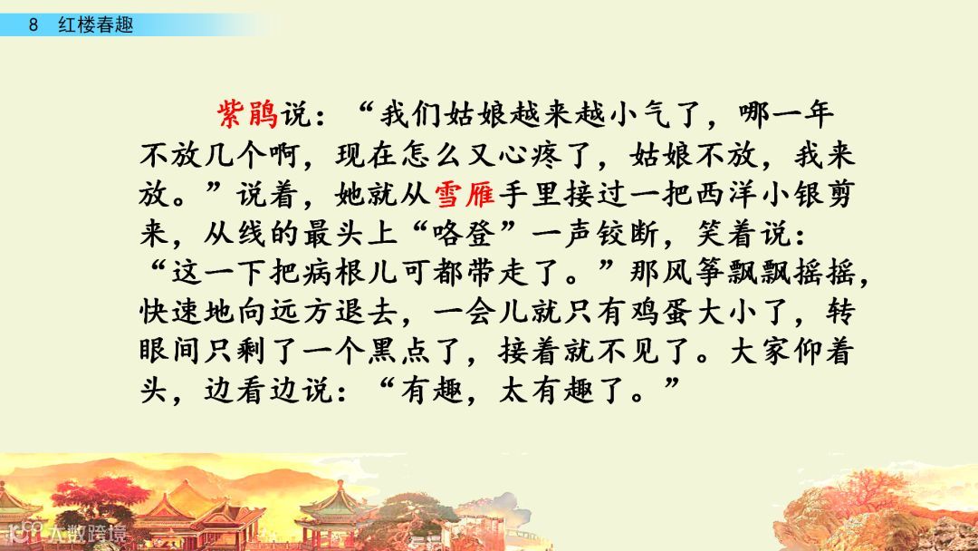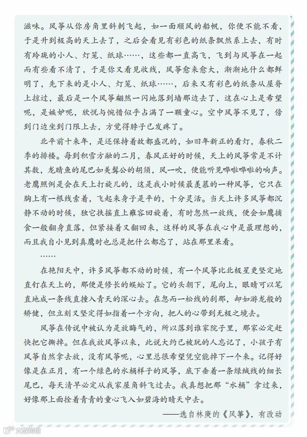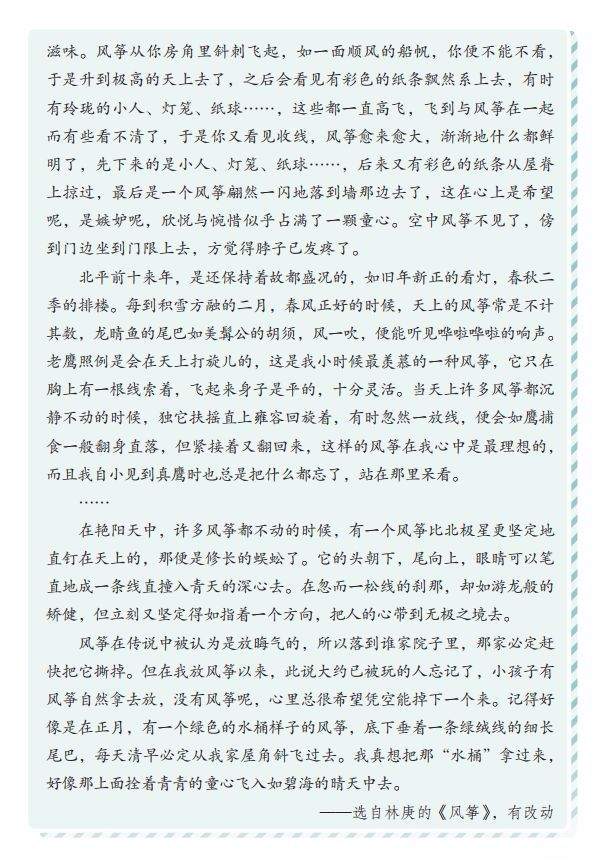 4.风筝被绞断了线,随风而去,越飞越高。开始,他们看到的风筝只有鸡蛋大小;后来,风筝迅速飞去,人们只能看到一个小黑点;最后,风筝在天空中消失。这个句子写出了风筝在天空中迅速飞去直到消失的过程,抓住了风筝的姿态和形状,写得十分生动具体,表达了贾宝玉等放风筝时异常欢快的心情。