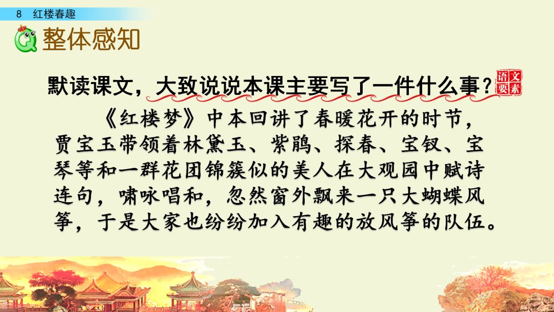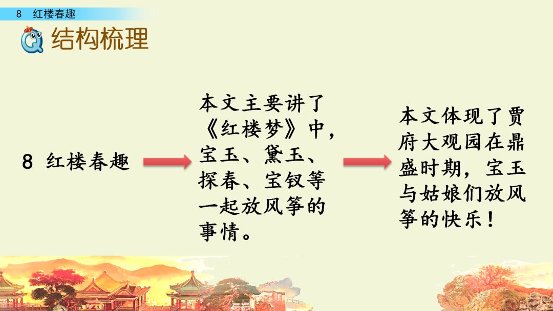第一部分(1~2):写大观园外飘来一只风筝,引起大家的兴趣,大家决定放风筝。