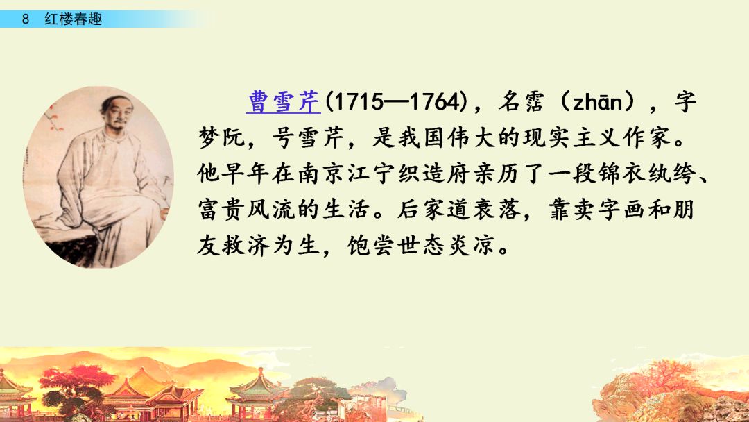 曹雪芹,名霑,字梦阮,号雪芹,又号芹溪、芹圃。清代著名文学家,小说家。他出身于一个“百年望族”的大官僚地主家庭,因家庭的衰败饱尝人世辛酸,后以坚韧不拔之毅力,历经多年艰辛创作出极具思想性、艺术性的伟大作品《红楼梦》。