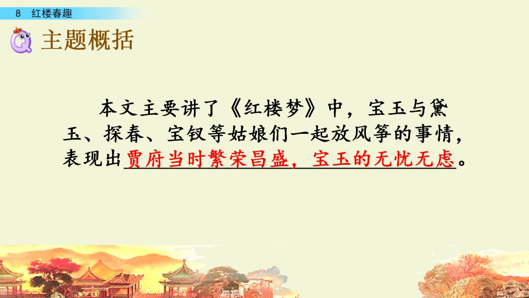 本文记叙了贾宝玉和众姐妹、丫头们在大观园放风筝的经过,突出了他们放风筝时的自由快乐,表现了大观园儿女的童真童趣和充满青春朝气的活力,体现了大家对大观园美好生活的热爱。
