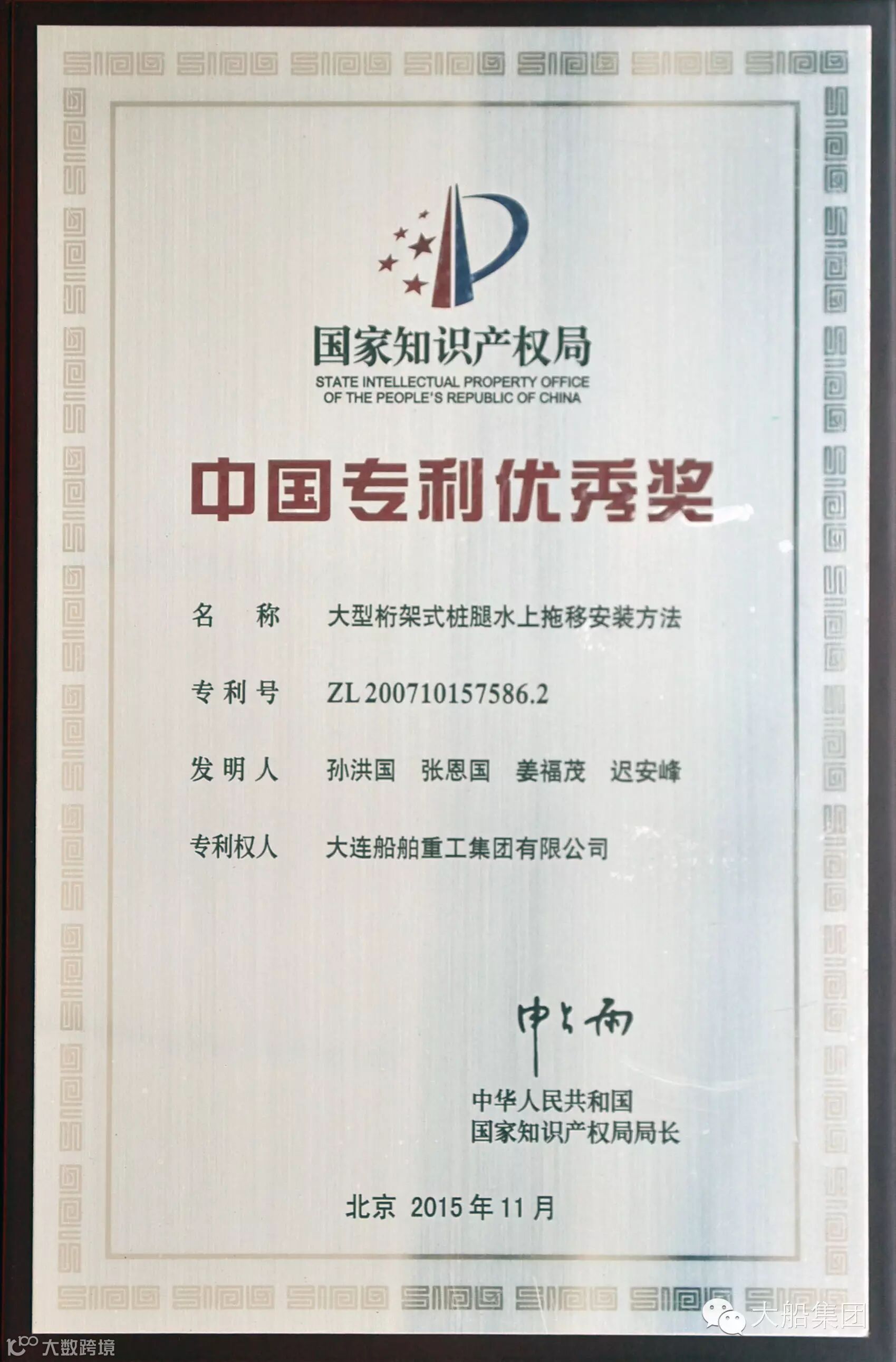 近日,国家知识产权局印发了《关于第十七届中国专利奖授奖的决定》,大船集团发明的“大型桁架式桩腿水上拖移安装方法”专利,喜获第十七届中国专利优秀奖。