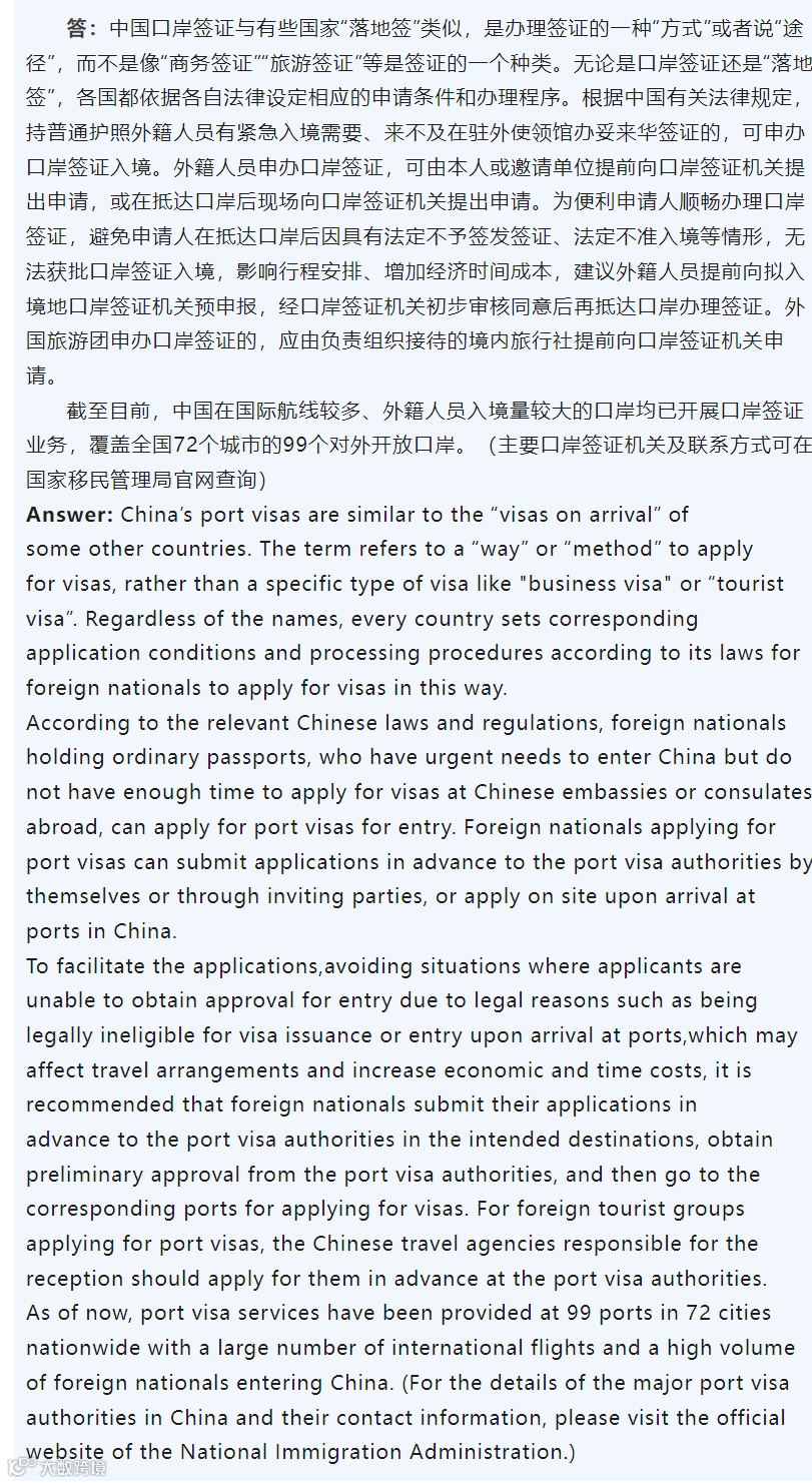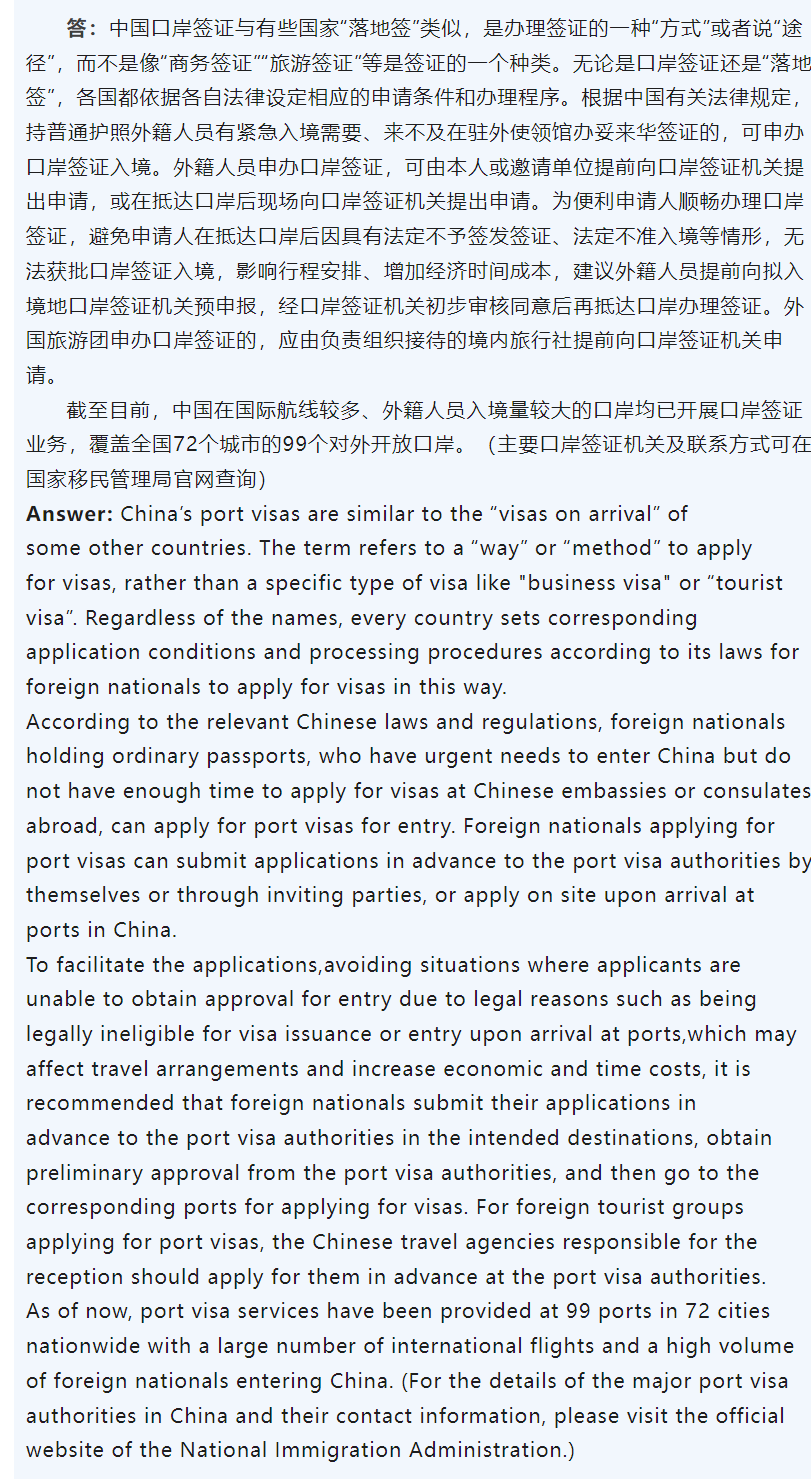 Q2:Do China’s port visas equal the commonly known “visas on arrival”? Which ports are authorized to issue port visas?