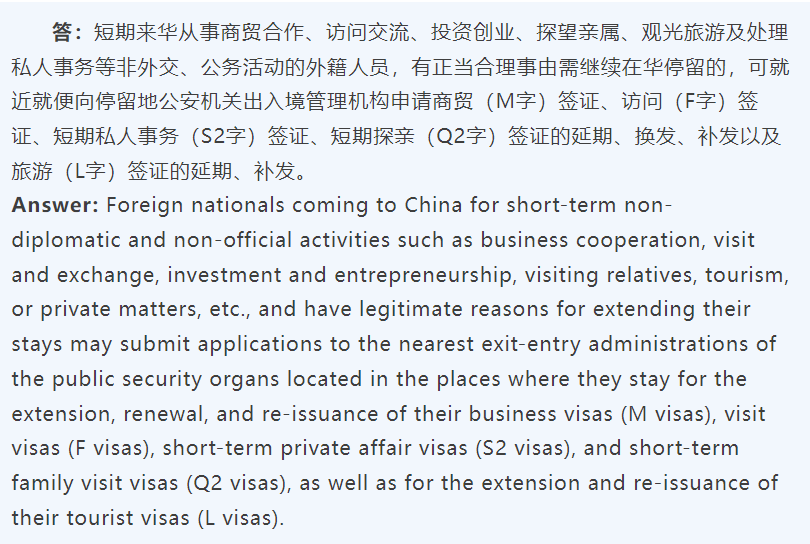 Q4:What types of visas can be extended, renewed, and re-issued for foreign nationals in China in their vicinity?
