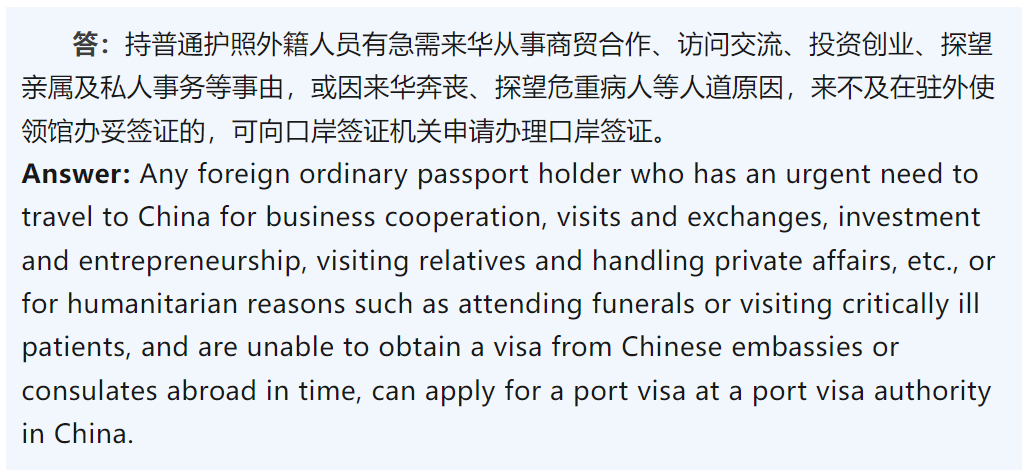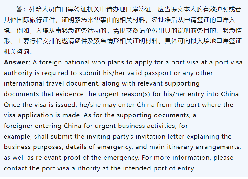 Q1:What are the “situations of urgent needs of entering China” that are eligible to apply for Chinese port visas?