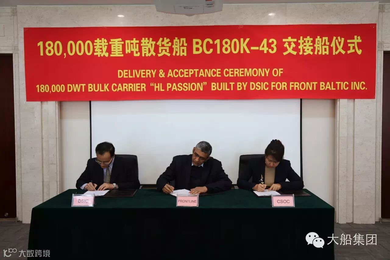 11月30日,大船集团为FRONT BALTIC INC.建造的18万吨散货船43号船“HL PASSION”号签字交工。FRONTLINE、中国船贸、大船集团三方代表在交接船证书上签字。