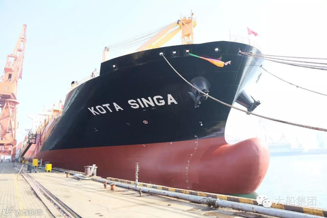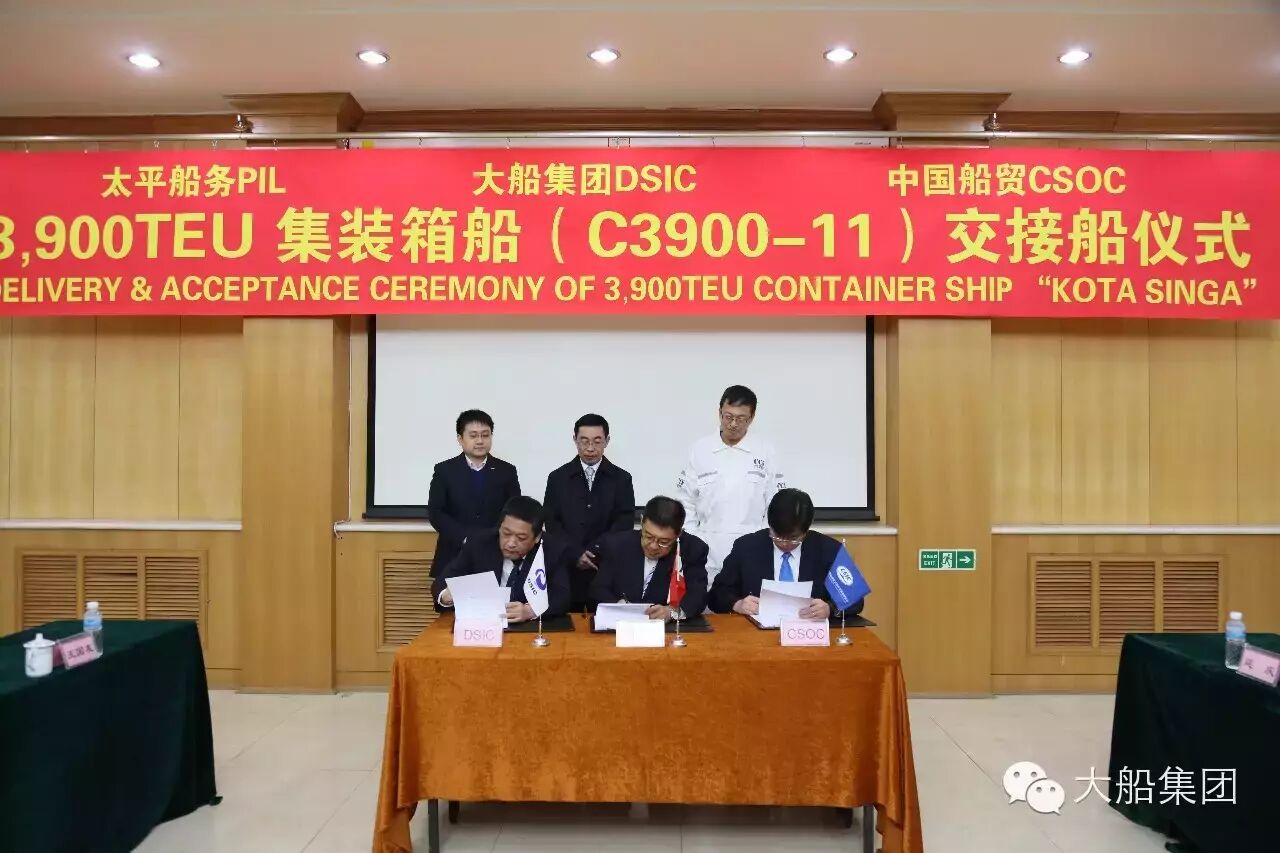 11月20日,大船集团为新加坡太平船务建造的3900TEU集装箱11号船“狮城”号顺利签字交工。太平船务、中国船贸、大船集团三方代表在交接船证书上签字。