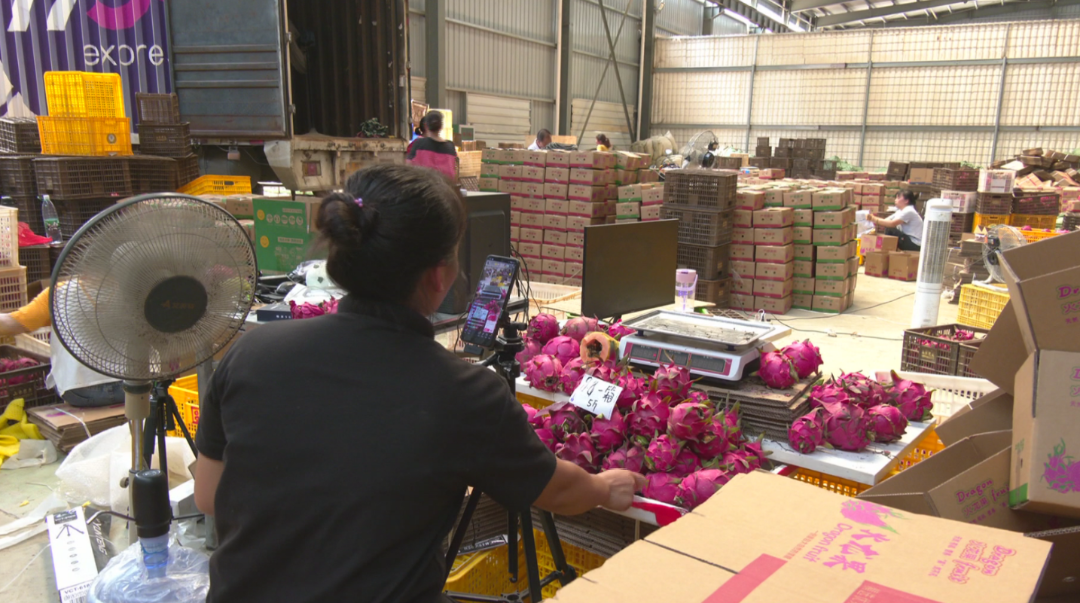 “一天大概能收农户3到5万斤左右的火龙果,我们收回来的那些水果都是以直播方式去销售的,线上成交量还是挺可观的。”刚下直播的黄丽霞乐呵呵地说。