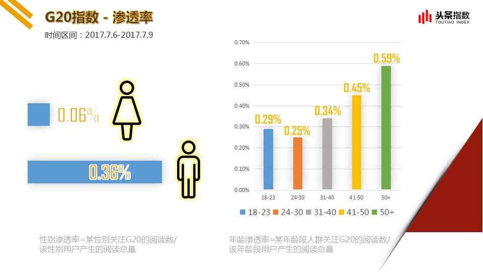 根据数据显示,相比女性,男性更加关注G20话题,其渗透率是女性的六倍多。而从年龄渗透率来看,40岁以上的用户拥有更高的渗透率。