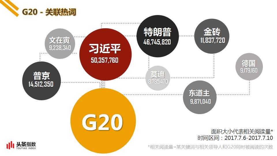 将G20作为关键词,通过用户的阅读量数据,我们发现与G20联系最为紧密的领导人/国家是中、美、俄三国。美国总统特朗普上台以后接连发生退出TPP、巴黎协定等等一系列惊人之举,本次会议又是他首次出席峰会,因而特朗普受到了极大的关注。
