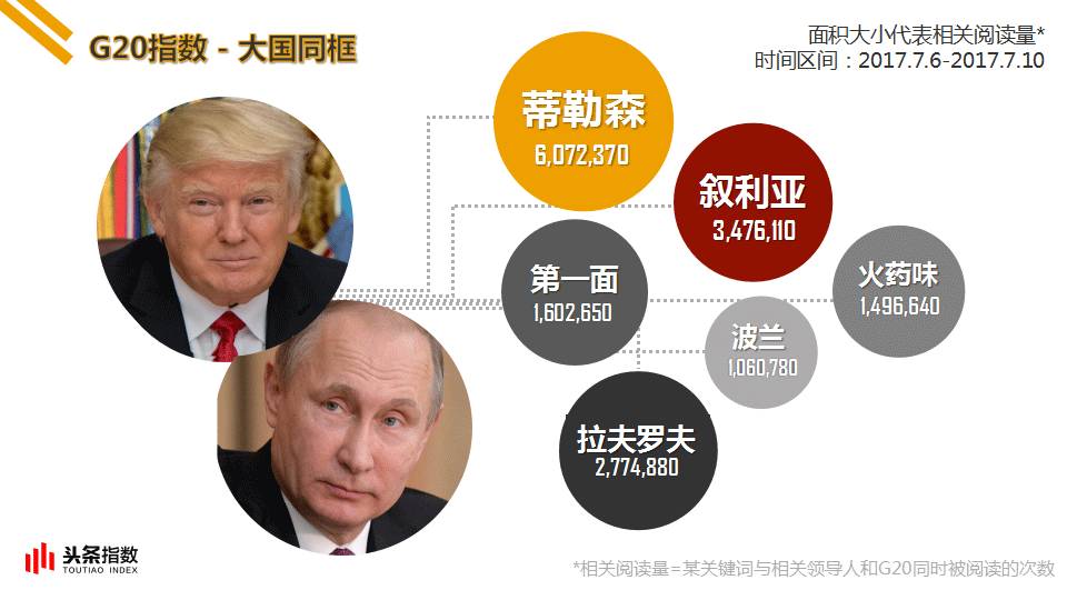 当 美国总统特朗普与俄罗斯总统普京 同框,在G20的背景下,他们的第一次相遇本身就是一件备受关注的事情,可以说,全球的目光都投向了“双普会”。与此同时,两国之间的叙利亚问题和特朗普近期的波兰华沙之行是最受用户关注的议题。在下图中蒂勒森和拉夫罗夫分别是美国国务卿和俄罗斯外交部长。