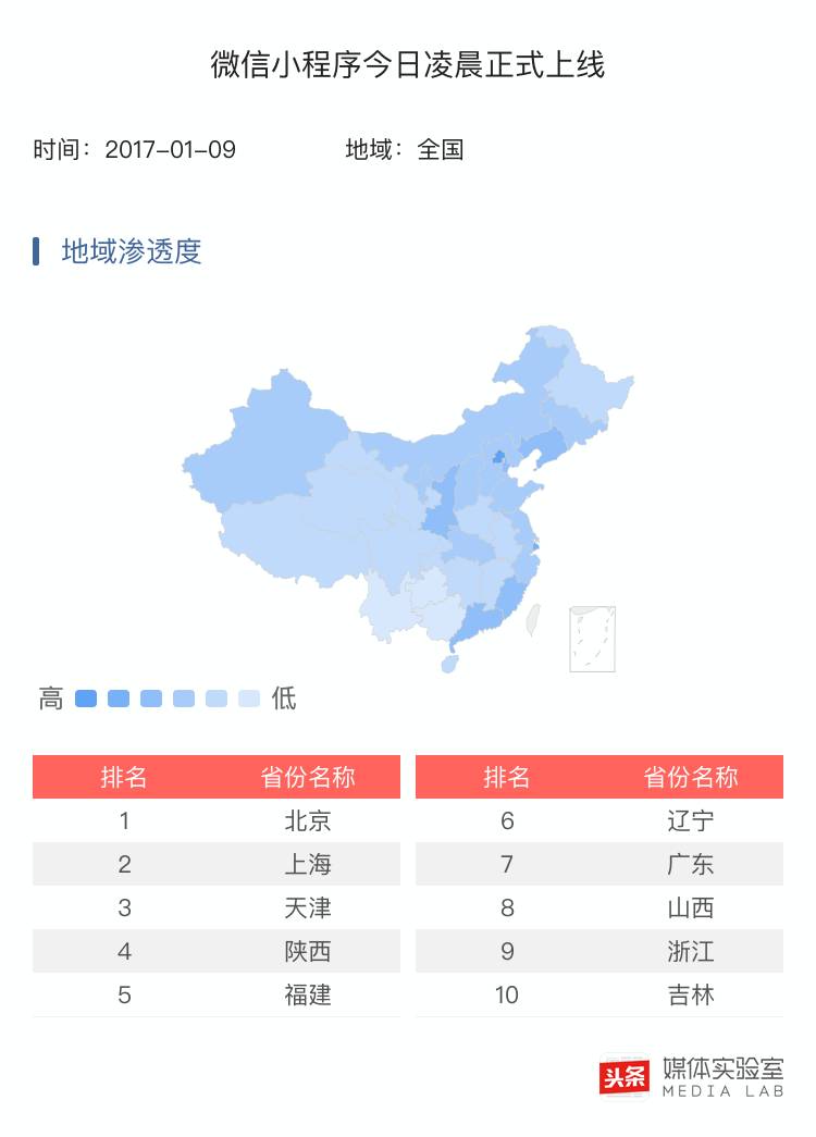 从图表中可以发现,北京、上海、天津最关注小程序,广东竟然排在第七。