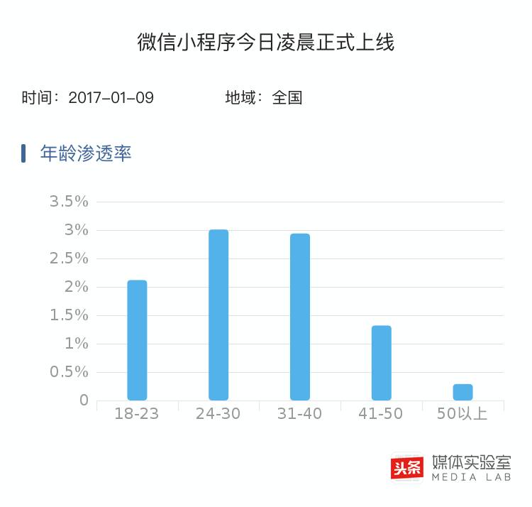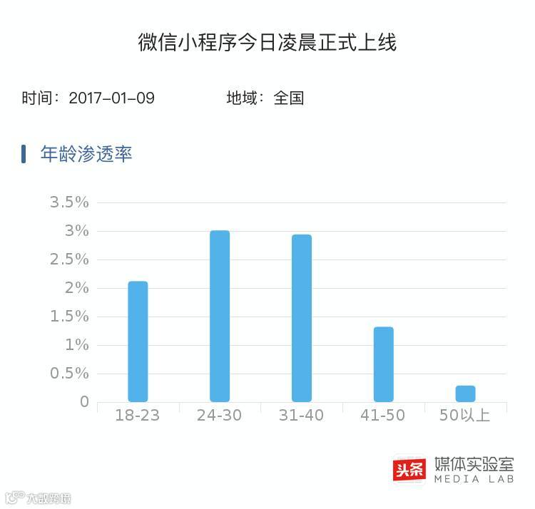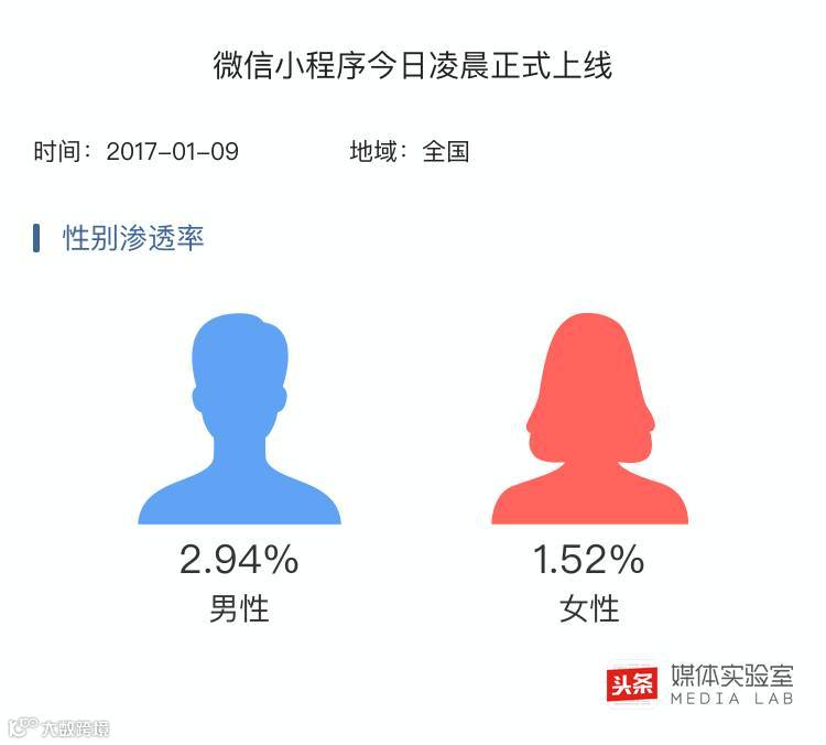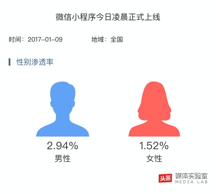 同时,在图表中,18-40 岁的用户最关注小程序,和现在互联网的从业人员年龄保持一致。当然,男性渗透率还是高于女性的。