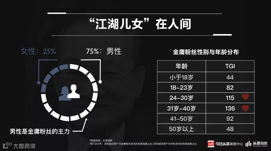 在如此体量的关注下,“江湖儿女”也遍布全国。头条指数显示,31-40岁的男性群体是金庸粉丝的主力,上海则成为“江湖儿女”分布的大城。