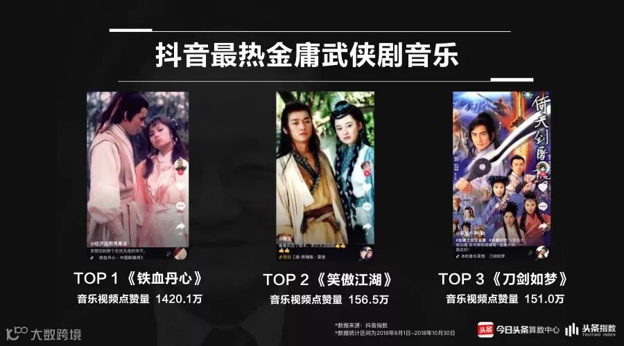 根据抖音指数,《铁血丹心》、《刀剑如梦》和《笑傲江湖》成为最受用户喜爱的武侠影视剧歌曲,其中,以《铁血丹心》为背景音乐的视频点赞量在短时间内达到了1400万。可以说,人们不仅从视觉,更是从听觉上进入了金庸的江湖。