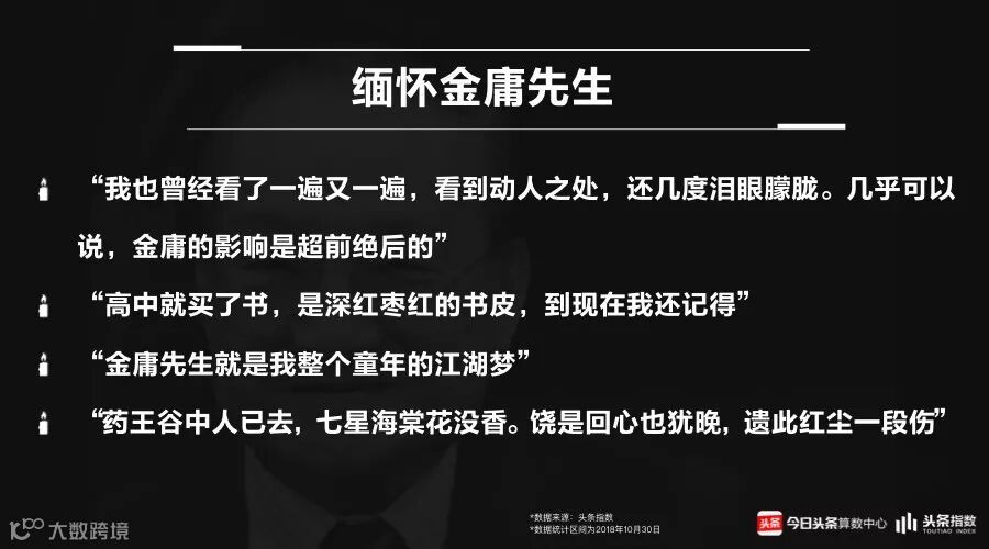 根据头条指数,10月30日,在金庸先生逝世消息传出的灰色下午,公众的关注程度迅速上升,并在当晚十二点达到顶峰。
