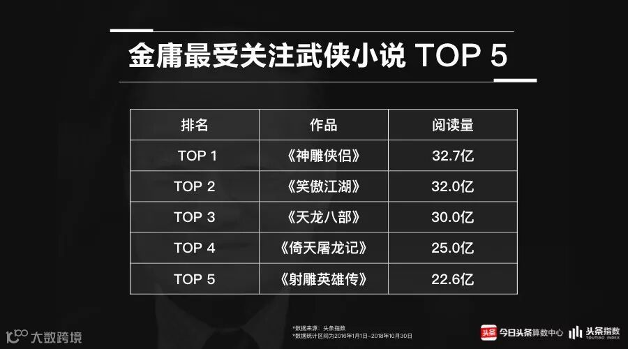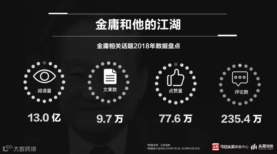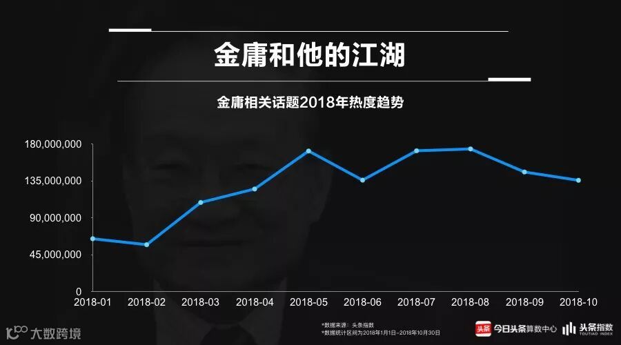 上世纪五十年代开启的新派武侠小说风潮,看似已随时间的年轮落幕,但实际上,金庸和他的江湖始终存在于公众视野。根据头条指数,与金庸相关的话题热度2018年一直处于高位,截止10月30日已产生了13亿的阅读量,整体趋势也在渐进式上涨。