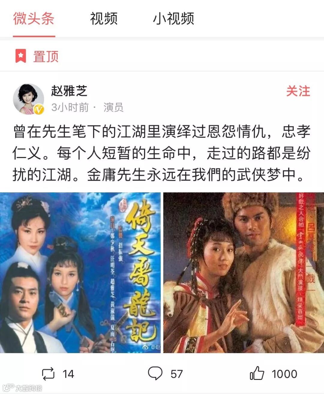 截止10月31日中午,微头条话题#金庸去世#已获得5.1亿阅读,5.5万讨论,张纪中、赵雅芝等人纷纷发文悼念,表达哀思。