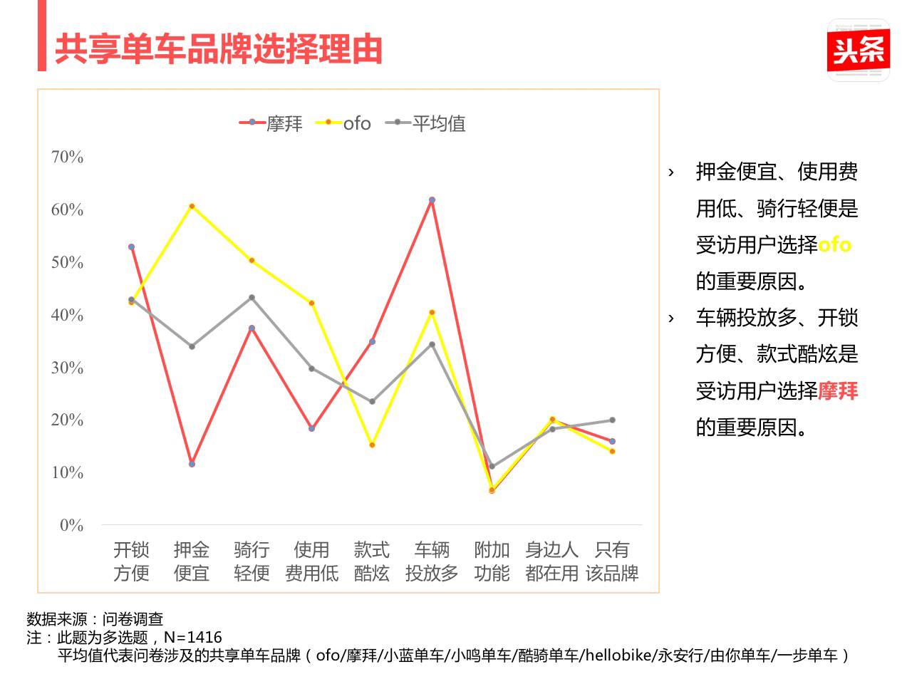 支持小黄车的人把押金便宜、使用费用低、骑行轻便当作重要原因。支持小橙车的人则更关心车辆投放多、开锁方便、款式酷炫。