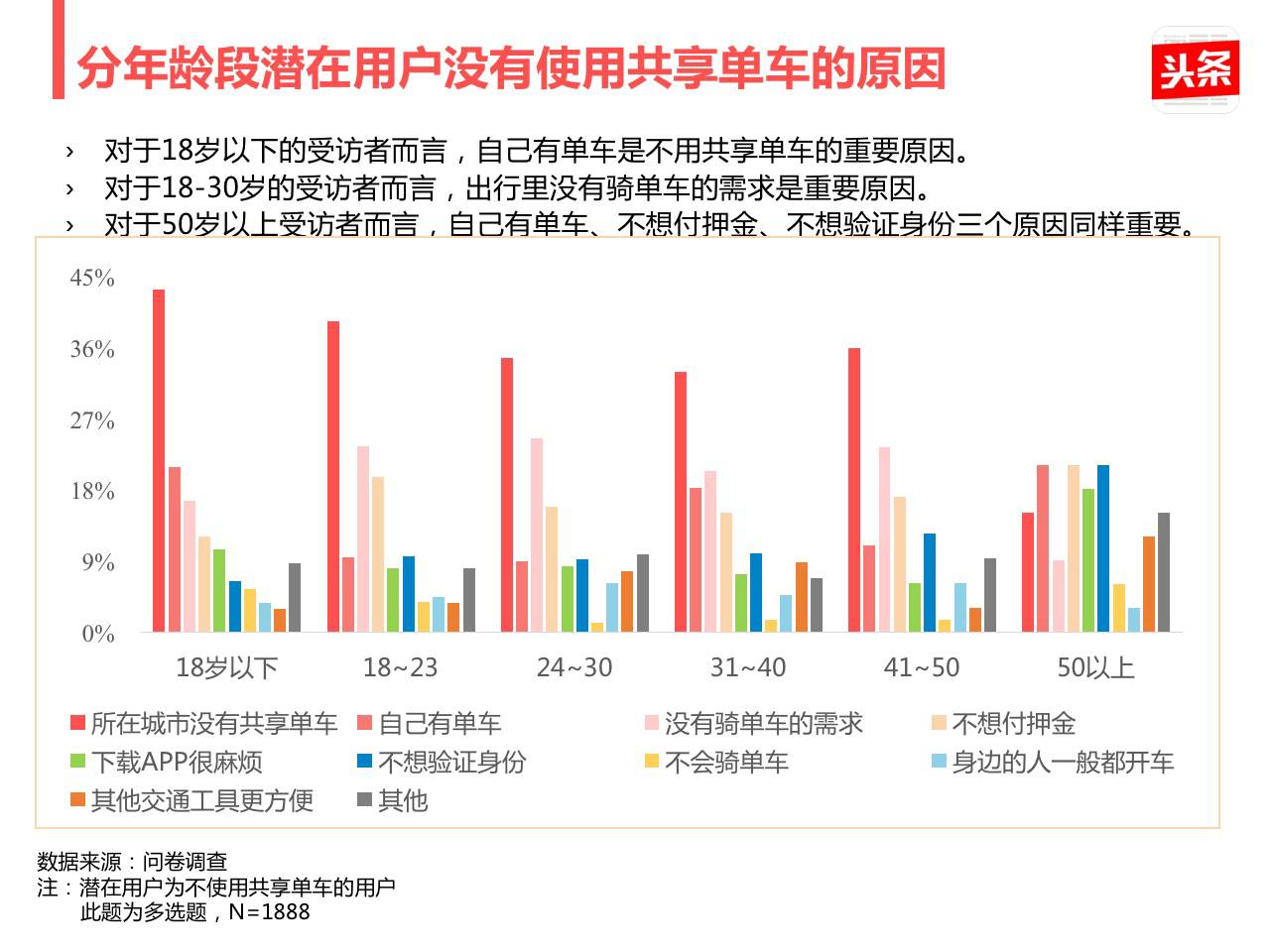 对于18岁以下的学生党而言,自己有单车是不用共享单车的重要原因。对于18-30岁的工作族而言,出行里没有骑单车的需求是重要原因。对于50岁以上受访者而言,自己有单车、不想付押金、不想验证身份三个原因同样重要。