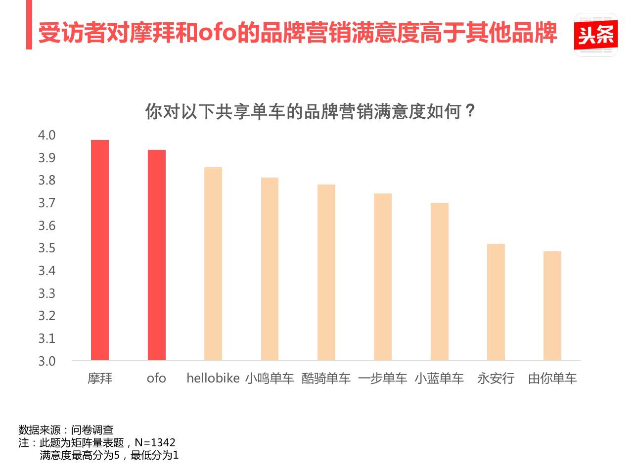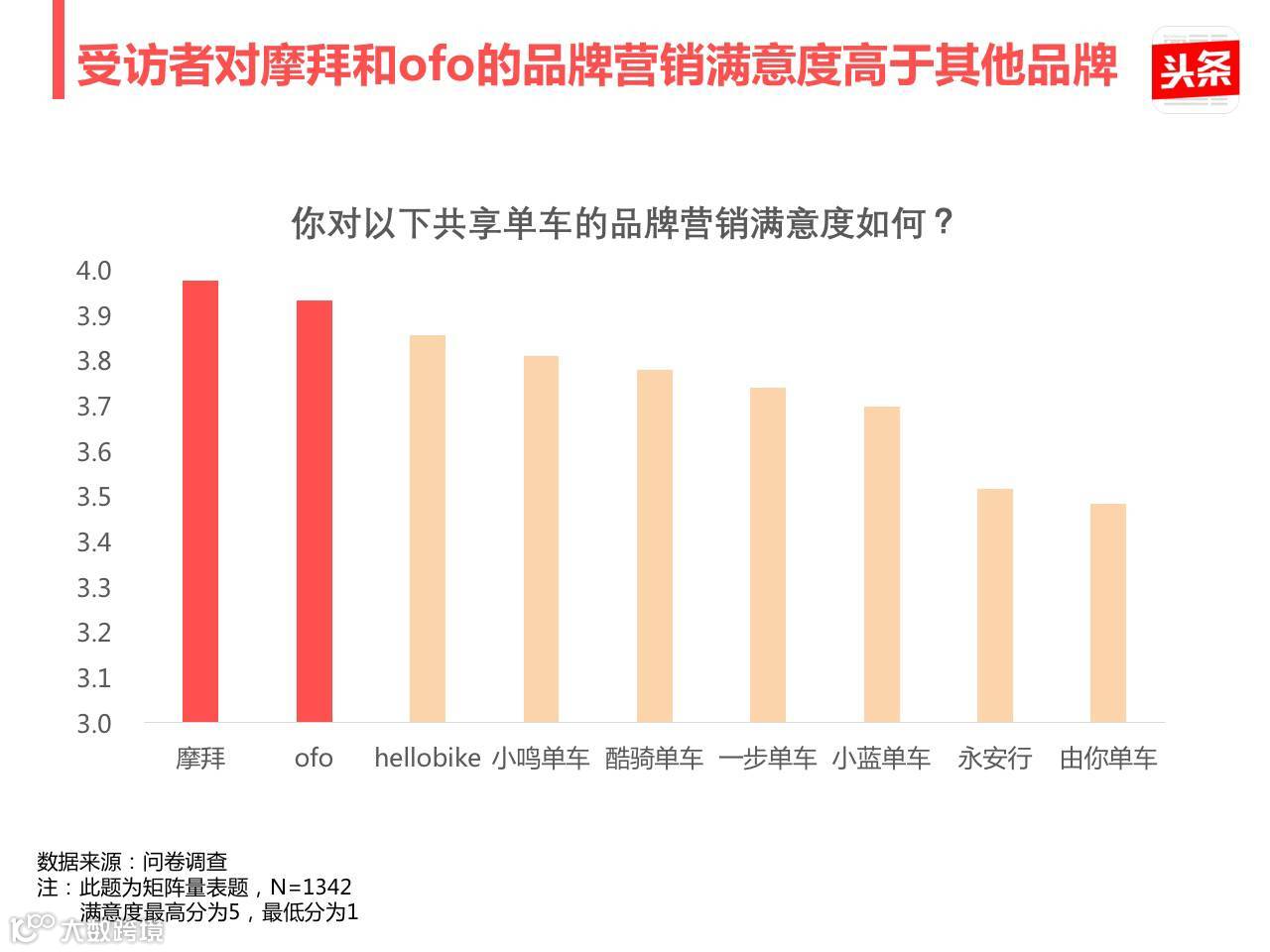 从品牌营销满意度上看,摩拜也略高于ofo。