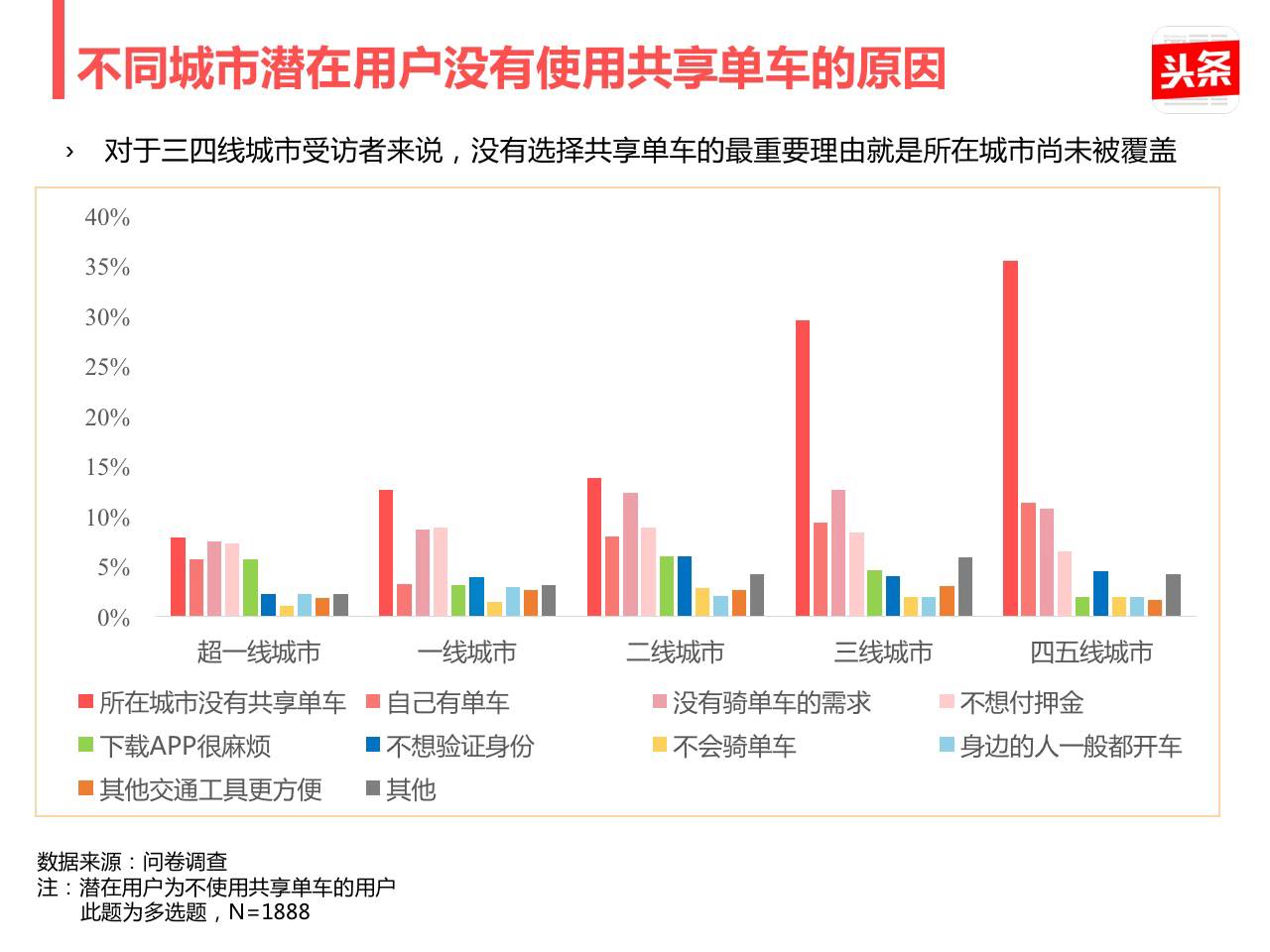 所在城市没有单车,是受访者没有选择共享单车的首要原因。可见三四线城市才是摩拜和ofo需要争夺的重要市场。