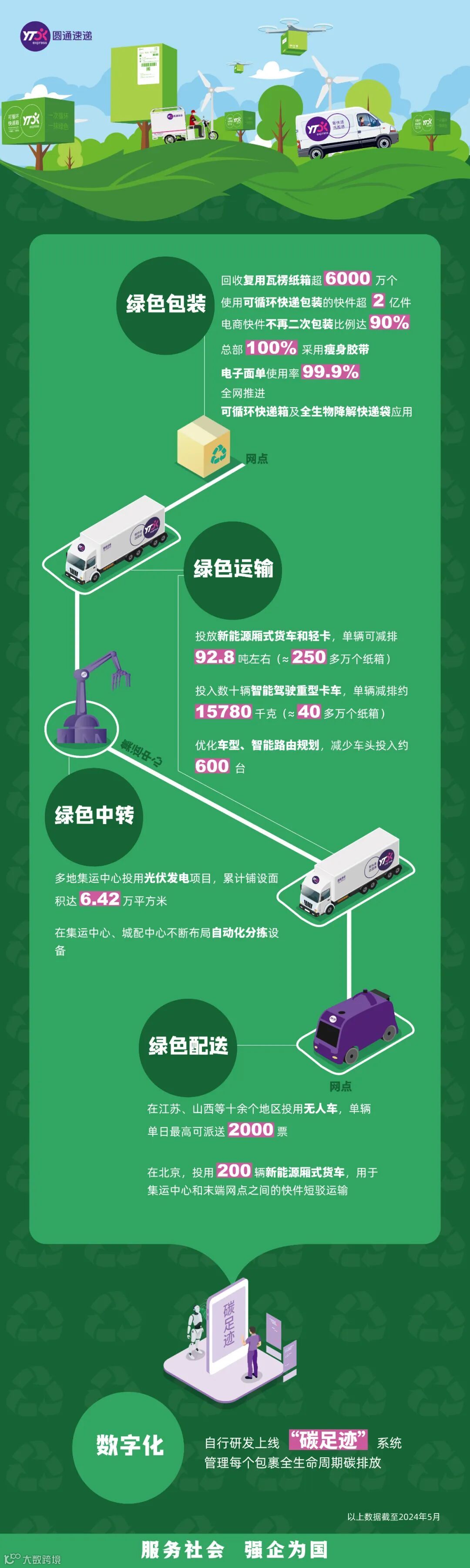 未来,圆通将以实际行动继续践行绿色环保理念,不断融合绿色发电、绿色配送、绿色交通、绿色包装等快递全流程,让包裹更安全、更快速、更绿色,不断提升客户体验。